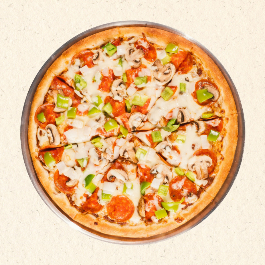 Con pepperoni, champiñones frescos, pimiento verde y cebolla. 35 cm de 8 rebanadas. (3 personas)