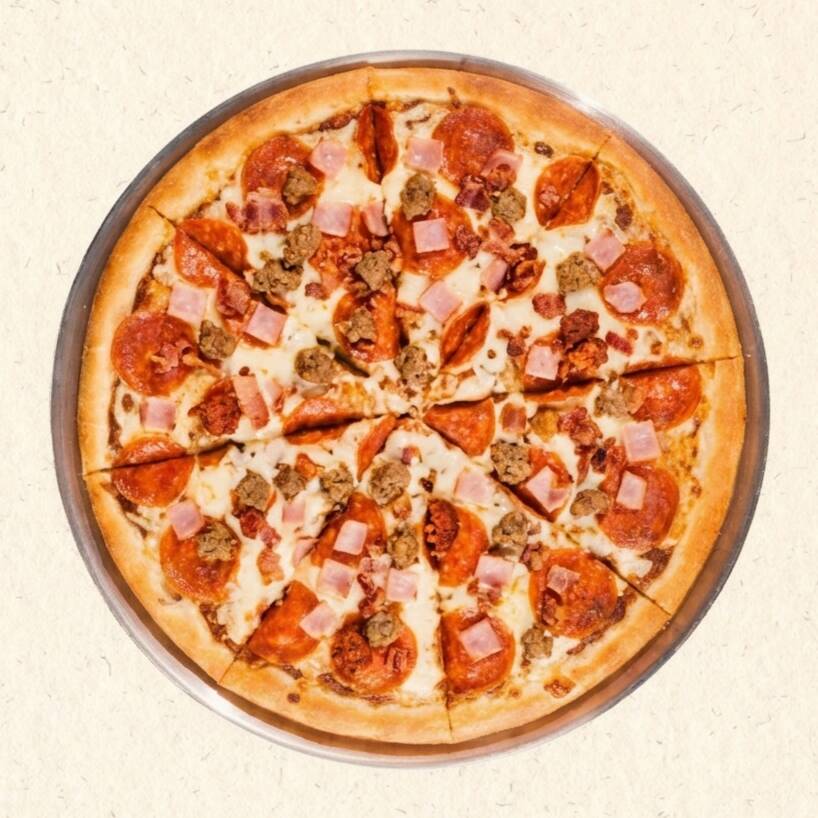Pepperoni, jamón, salchicha de res, chorizo, tocino. 35 cm de 8 rebanadas. (3 personas)
