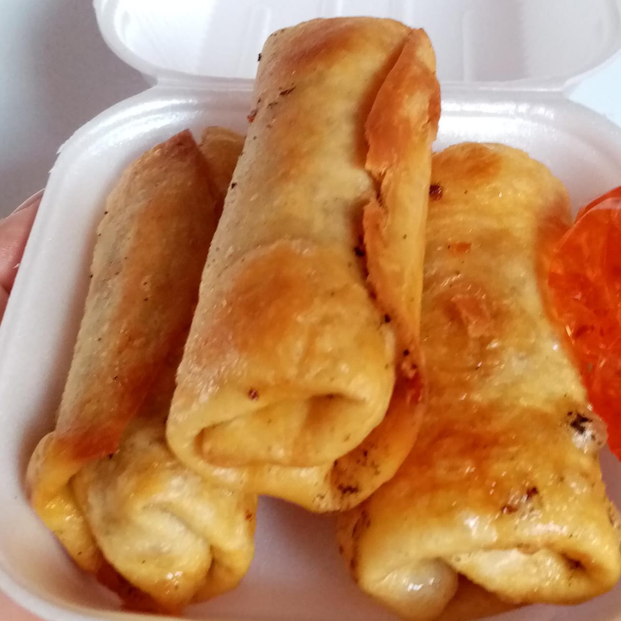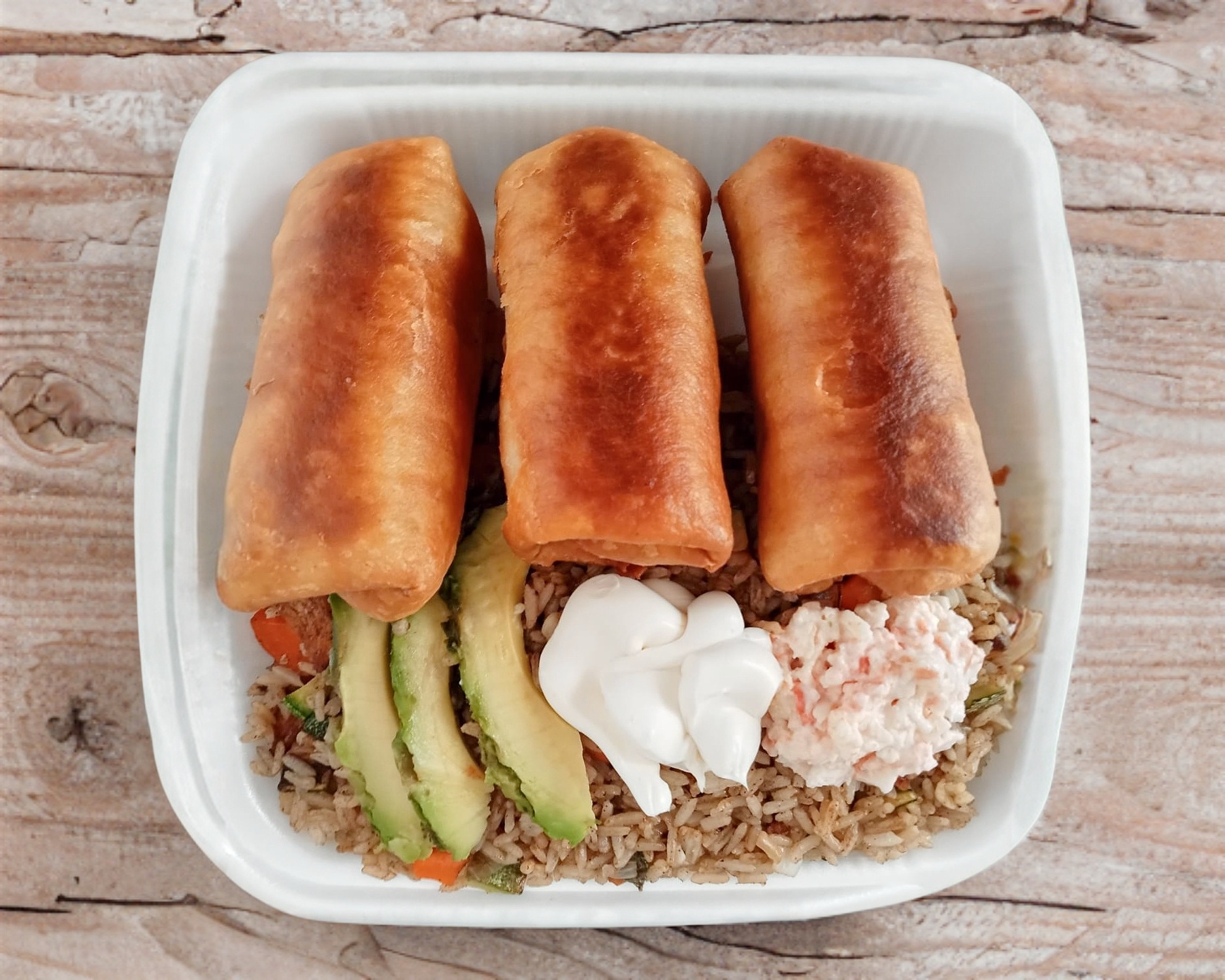 Sushi Empanizado de Surimi, Yakimeshi especial de pollo, 2 Rollos Primavera, 1 Te Helado