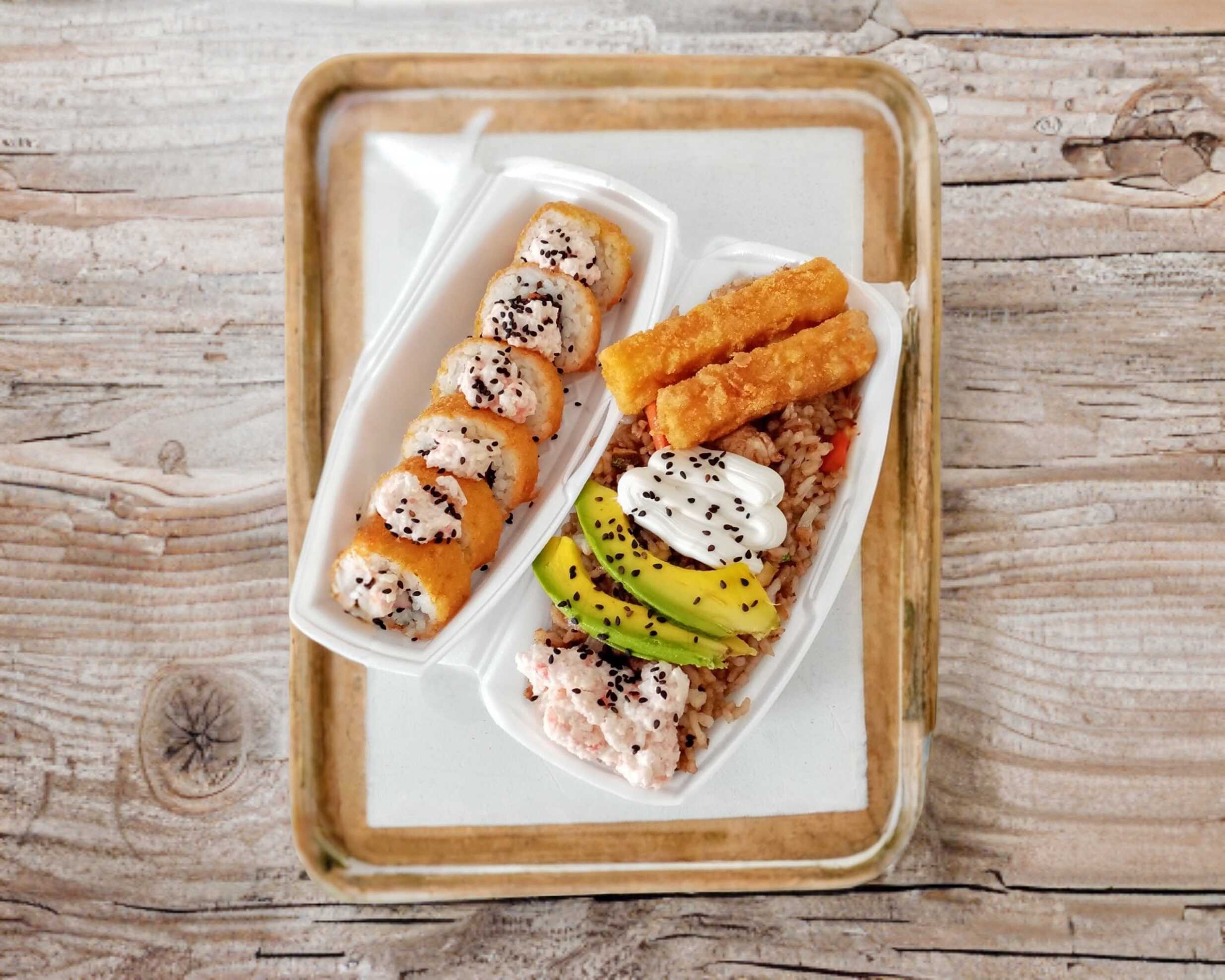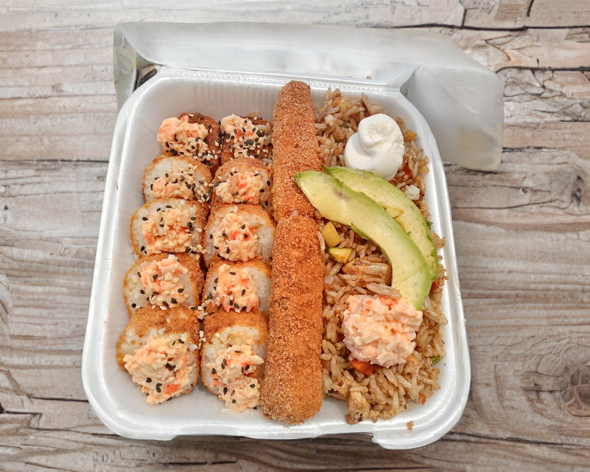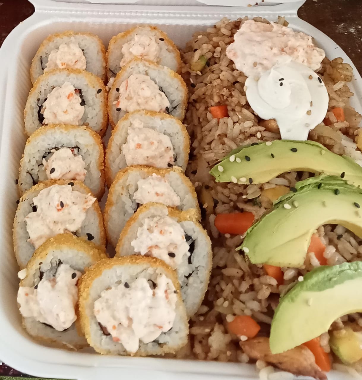 1/2 Sushi Empanizado De Surimi, Yakimeshi , 2 Dedos de Queso, 1/2 Te Helado