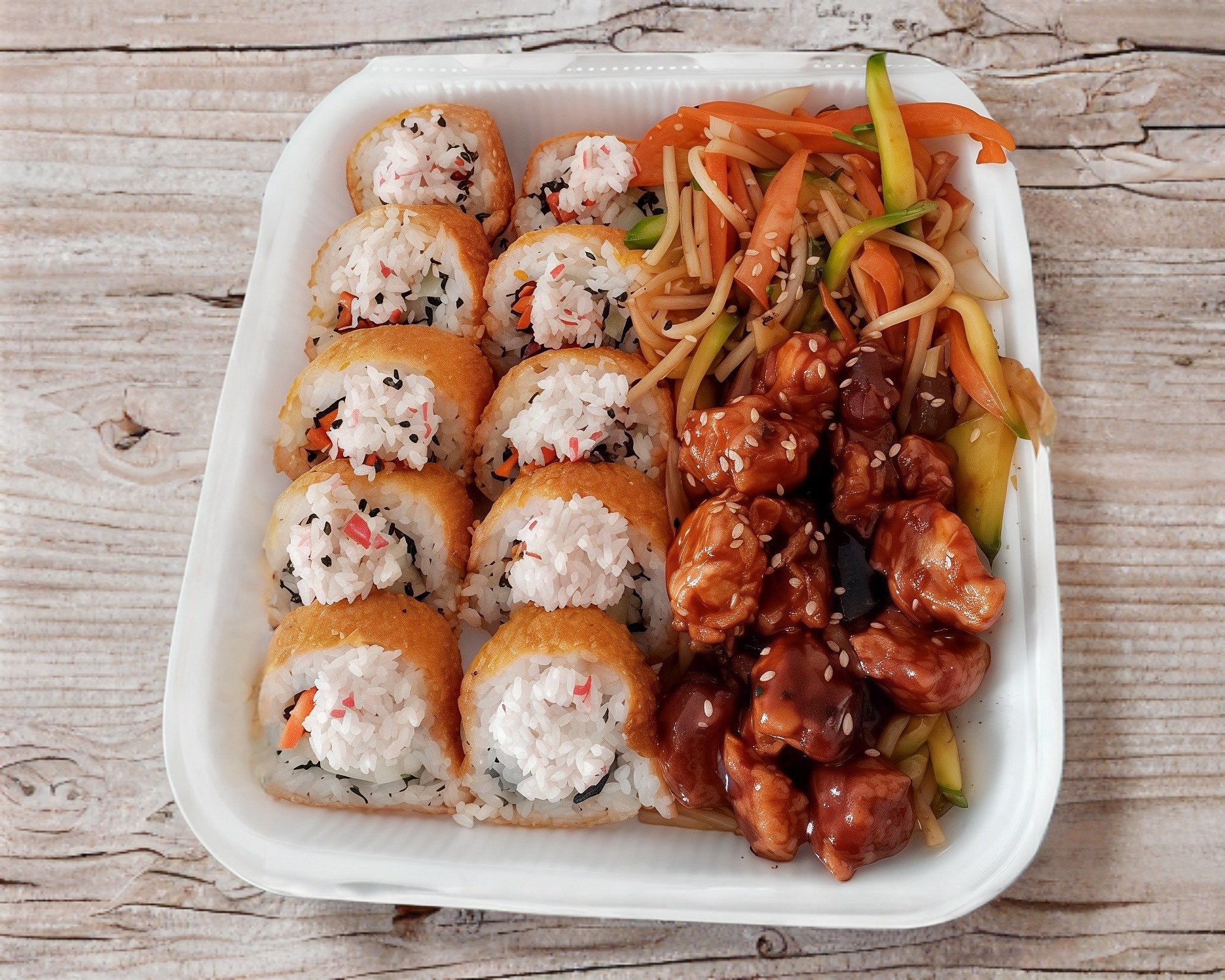 10 piezas sushi empanizado de surimi, tallarines, aprox 15 pedacitos pollo agridulce, 1/2 litro de te helado