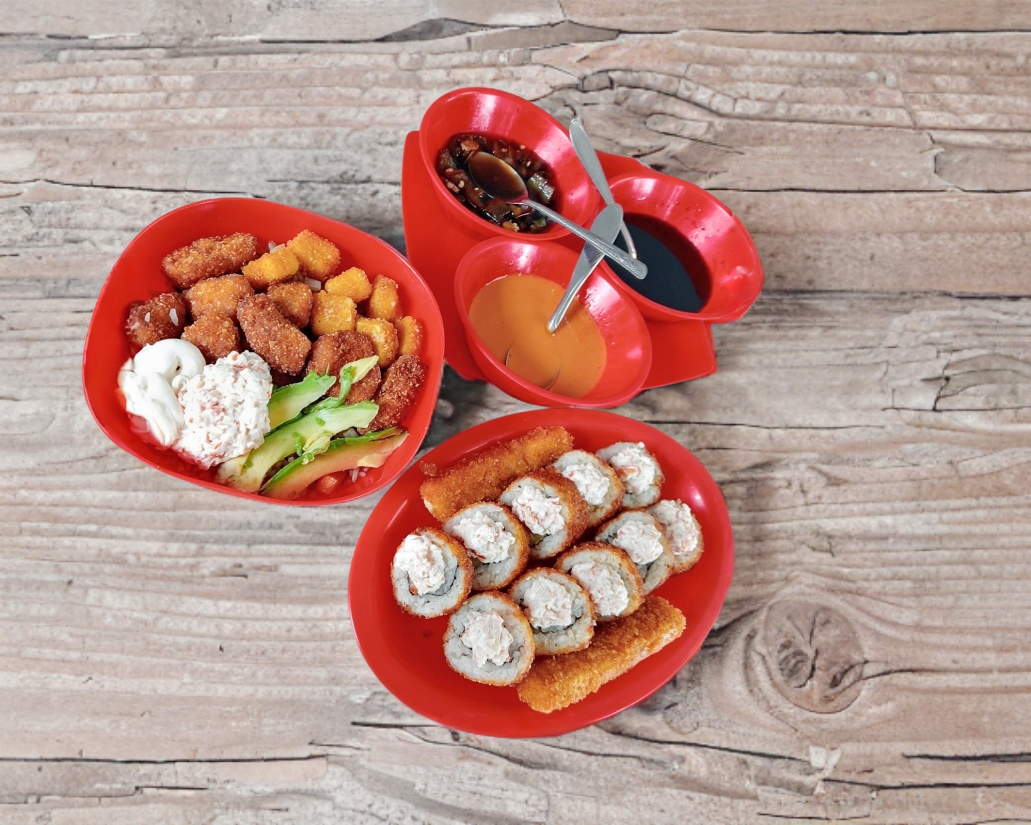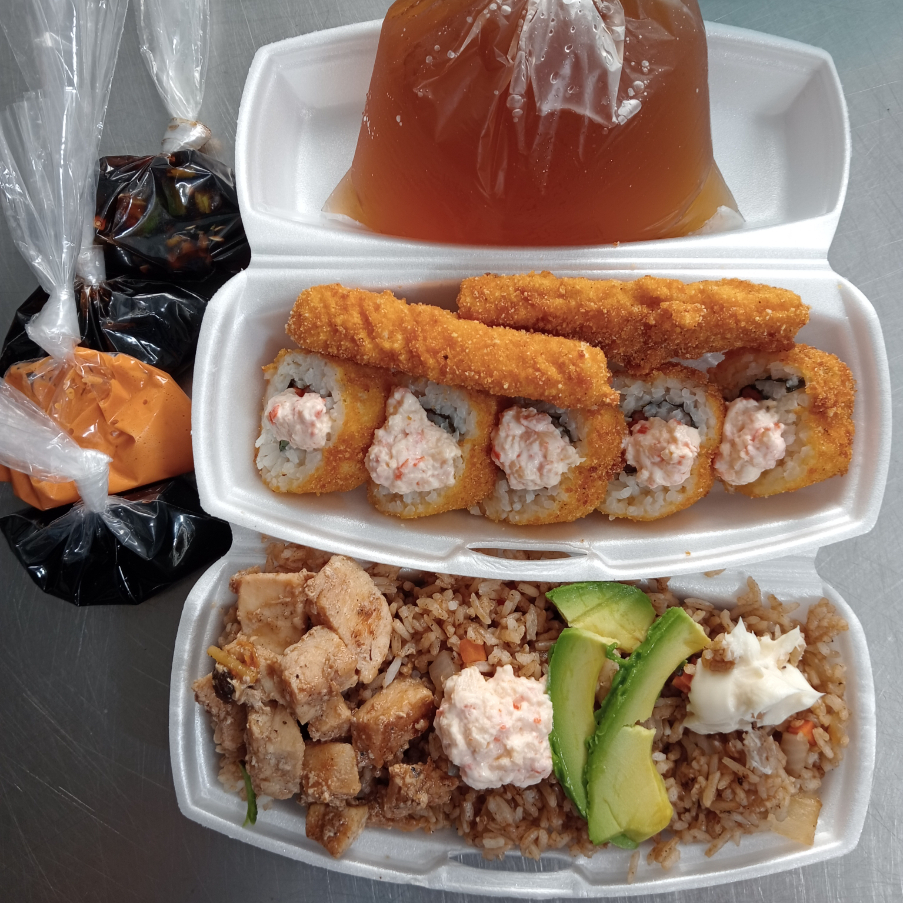 Sushi Empanizado de Surimi, Yakimeshi especial de pollo, 2 Dedos de Queso,1/2 Te Helado