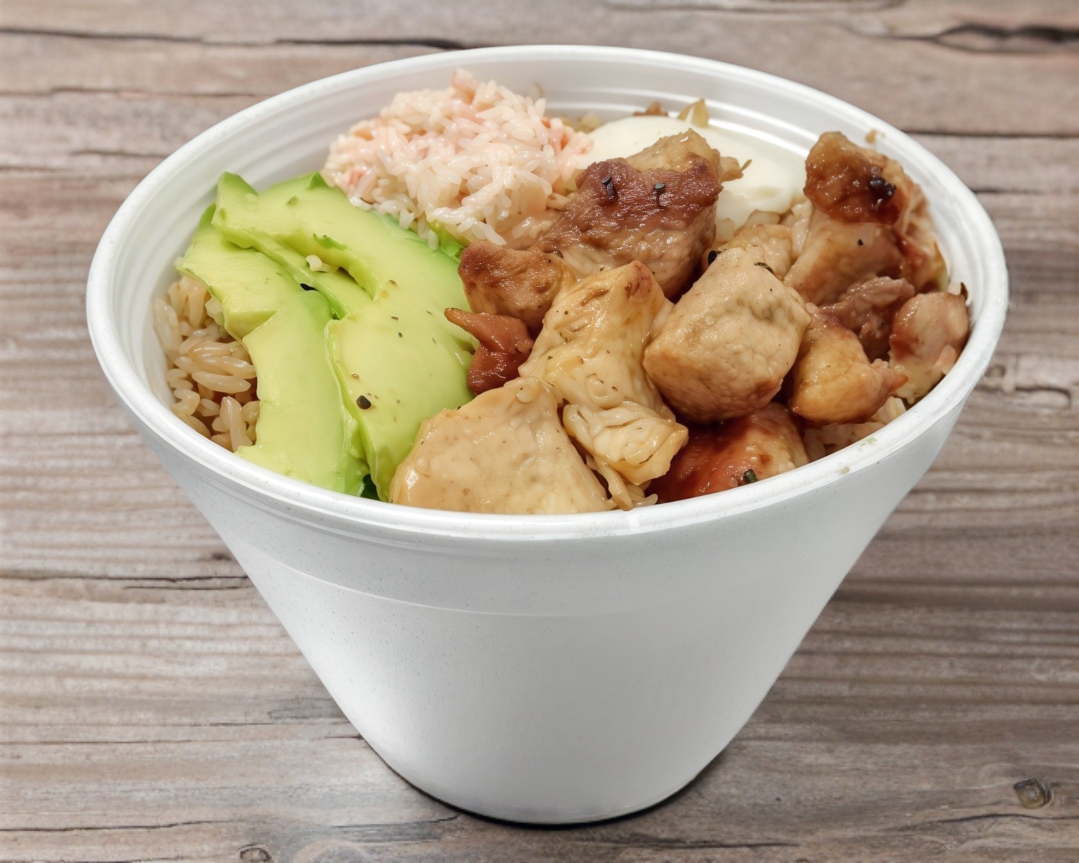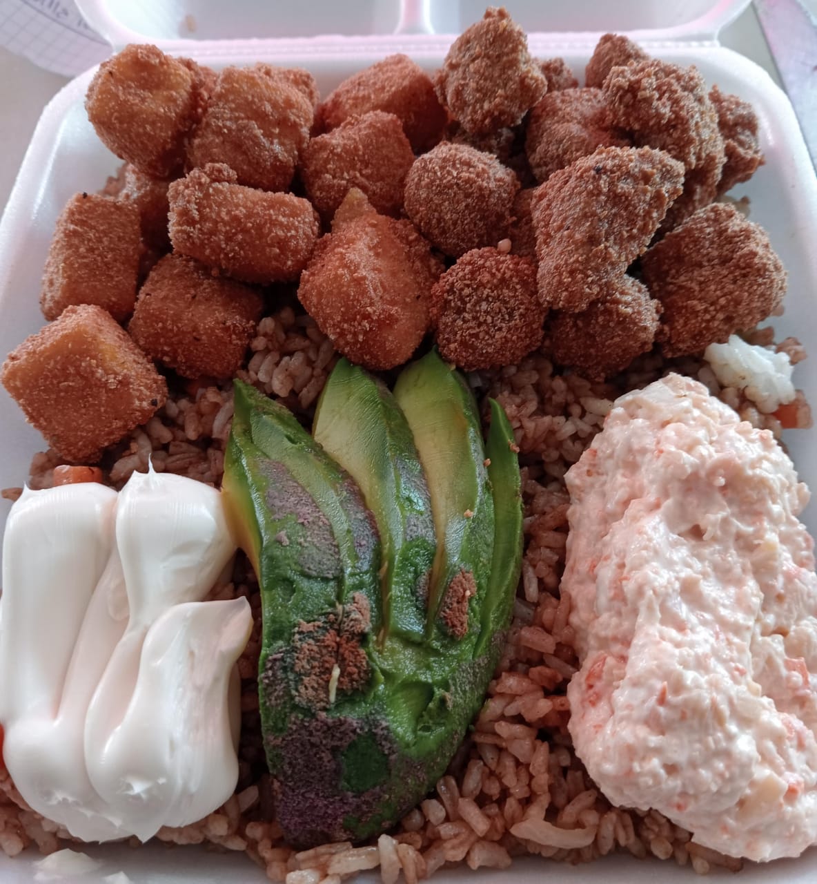 Arroz frito coronado con trozos de pollo, queso gouda empanizado, ensalada tampico, filadelfia y aguacate.