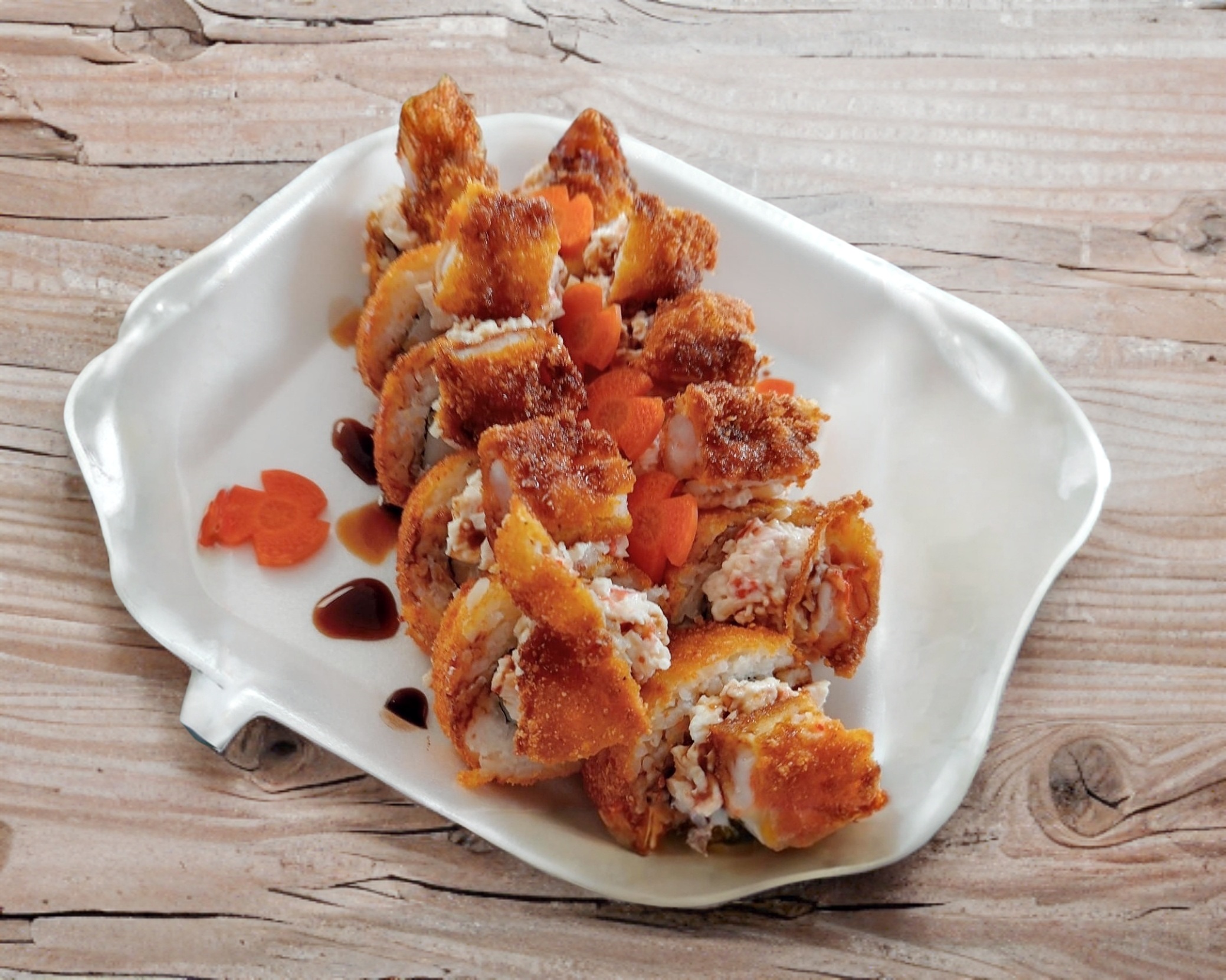 Por dentro: filadelfia, pepino, zanahoria y surimi. Por fuera: ensalada tampico coronado con camarones empanizados.