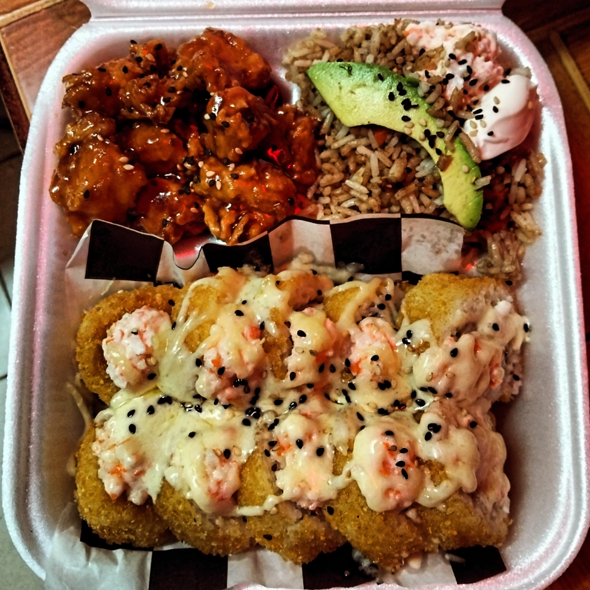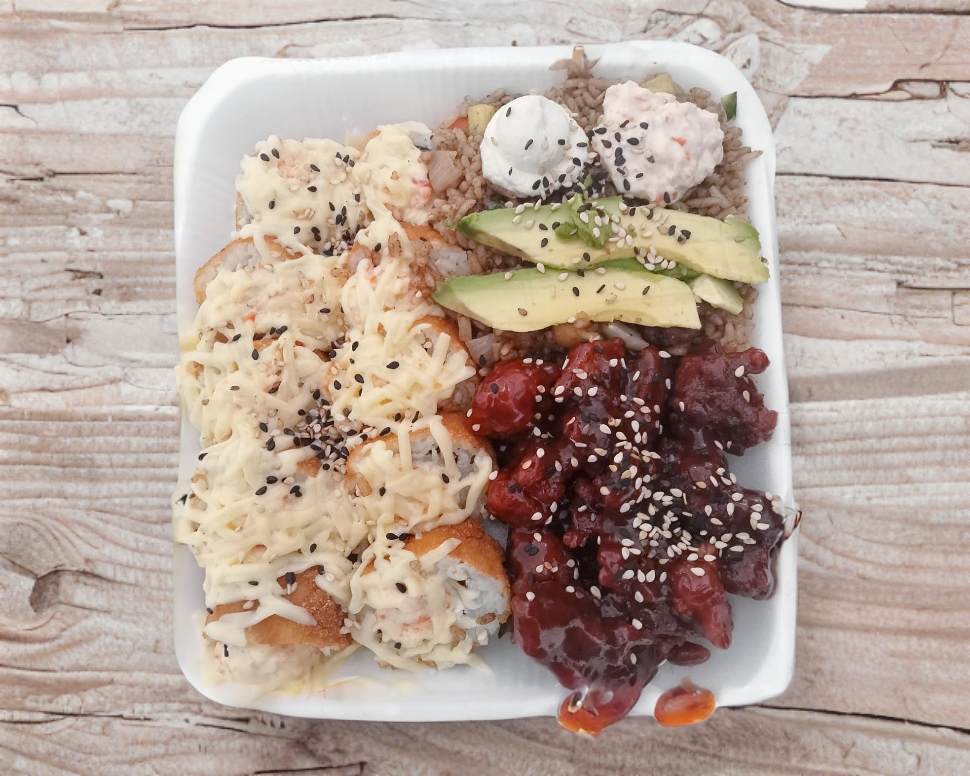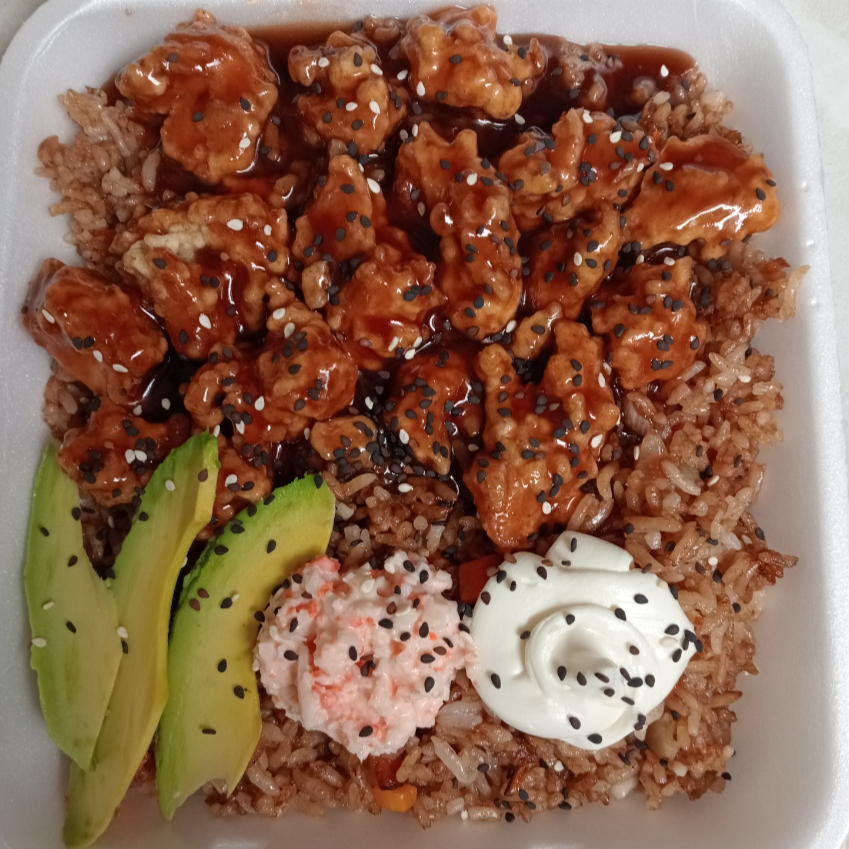 Arroz frito coronado con trozos de pollo , capeado en salsa agridulce, queso filadelfia y aguacate.