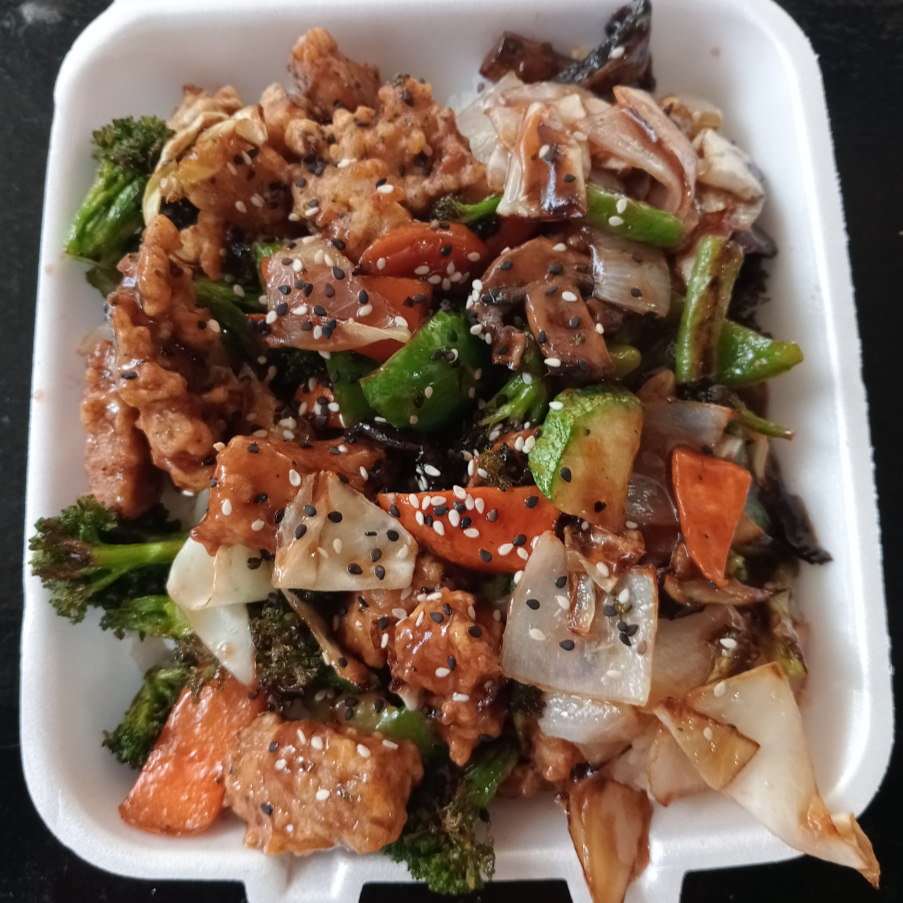 Verduras a la plancha con pollo perfectamente capeado, todo bañado en salsa agridulce con una cama de arroz blanco.