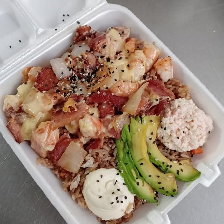 Yakimomia: Arroz frito con camarones, tocino y queso Gouda coronado con ensalada Tampico, Filadelfia y aguacate