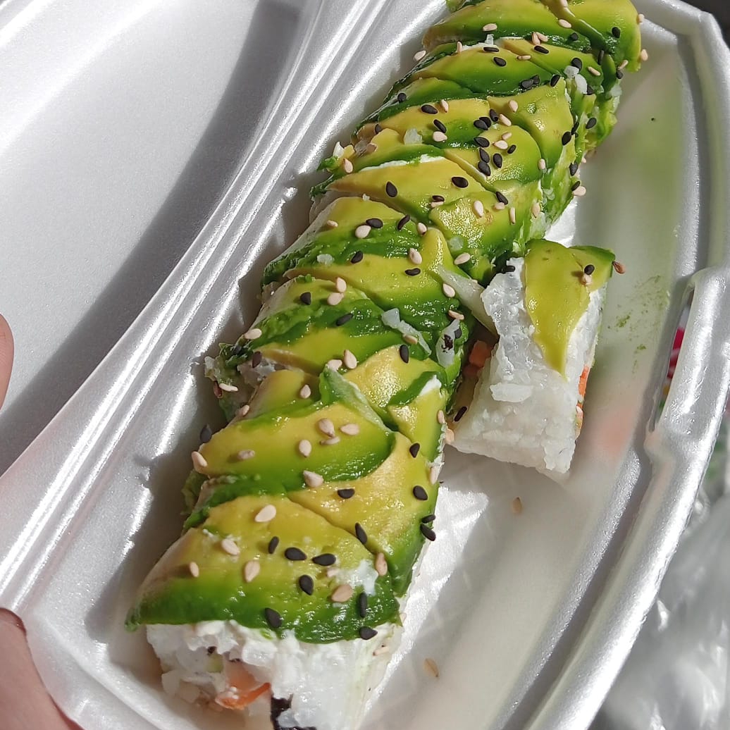 Por dentro: filadelfia, pepino, zanahoria y surimi. Por fuera: aguacate fresco.