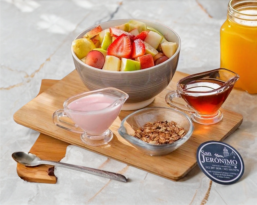 Fruta de temporada acompañada con miel, yogurt y granola.
