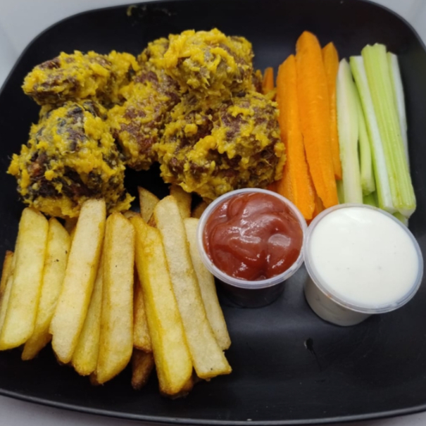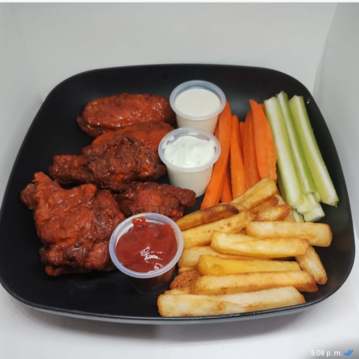 10 piezas con Salsa receta de la casa, porcion de papas fritas sin verduras, aderezo ranch y Catsup.