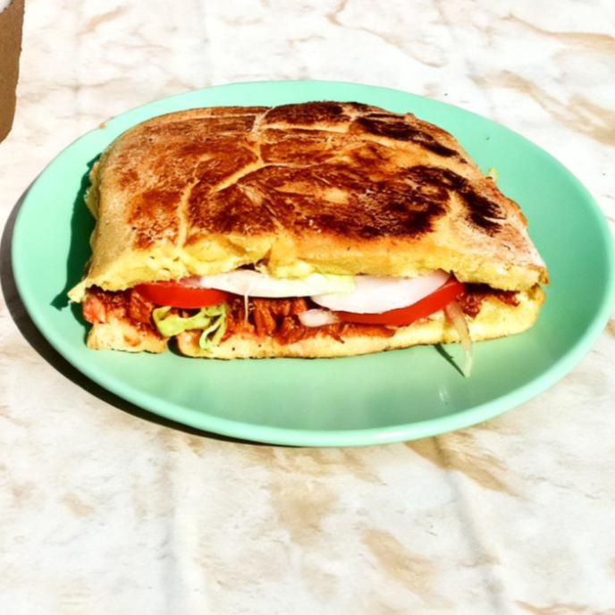 Lomo adobado, aderezo especial, Lechuga, Jitomate, Cebolla, Chile jalapeño y Aguacate.