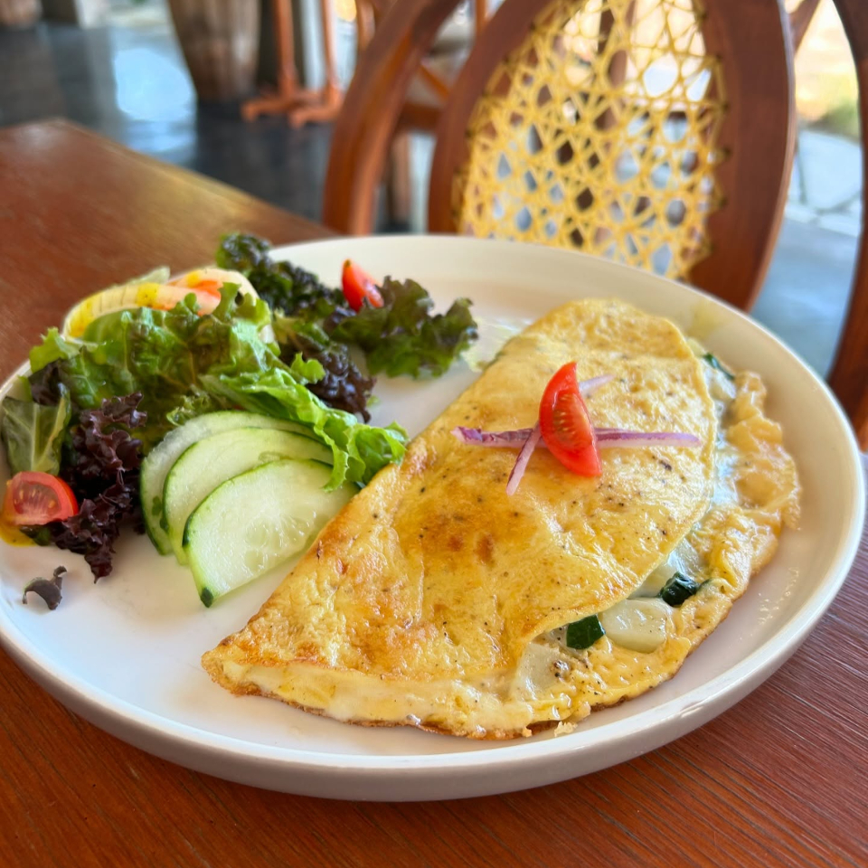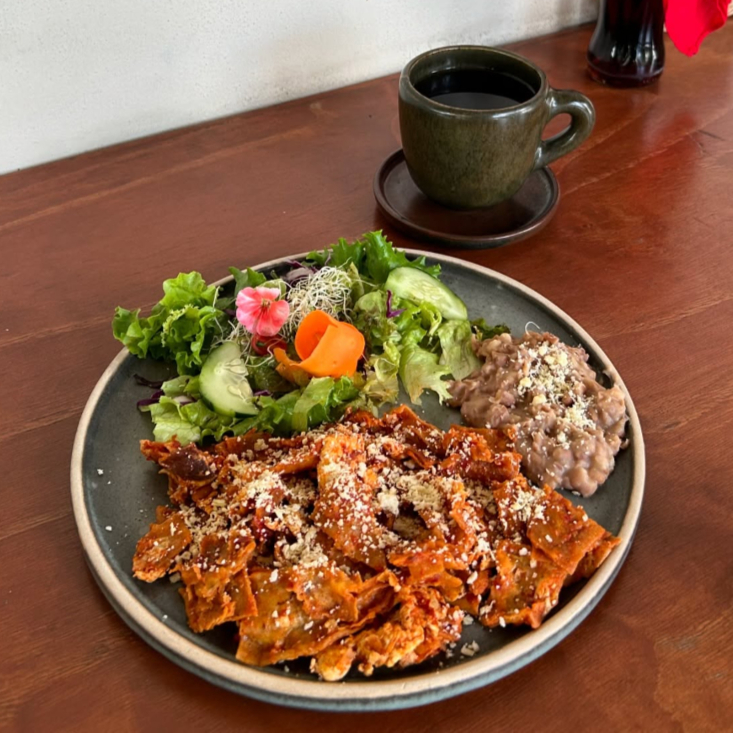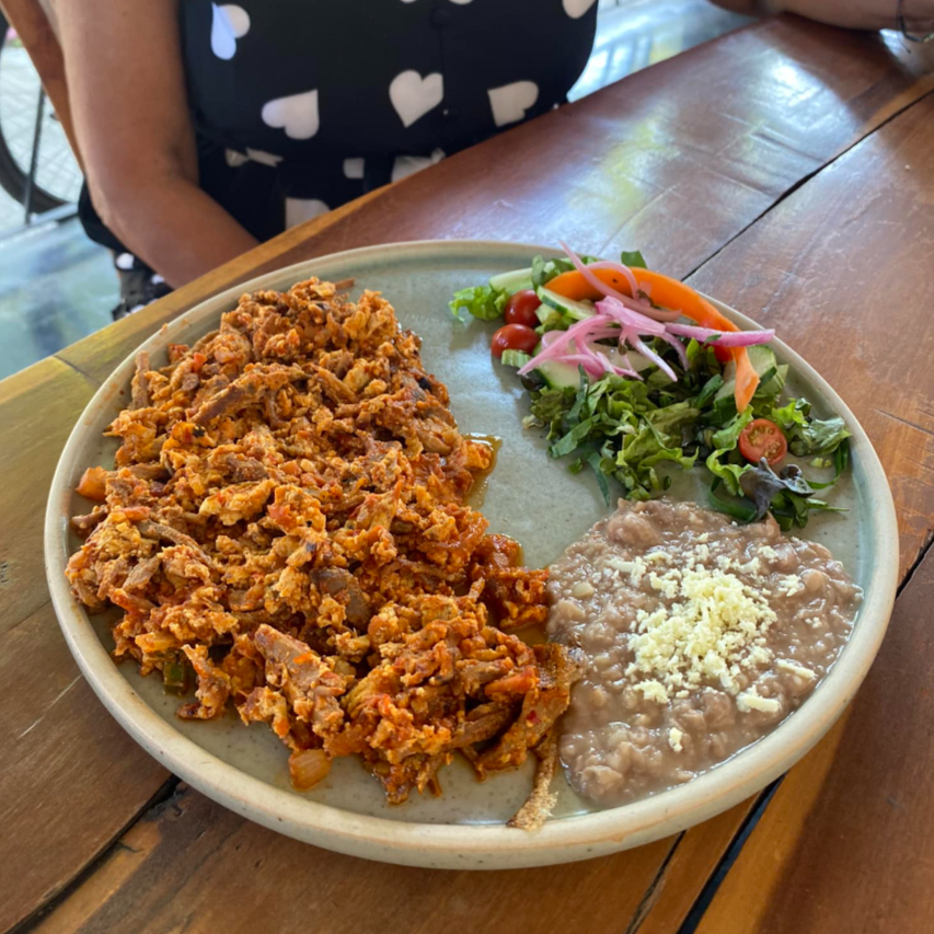 Tortilla con salsa roja, dos huevos, frijoles y ensalada.
