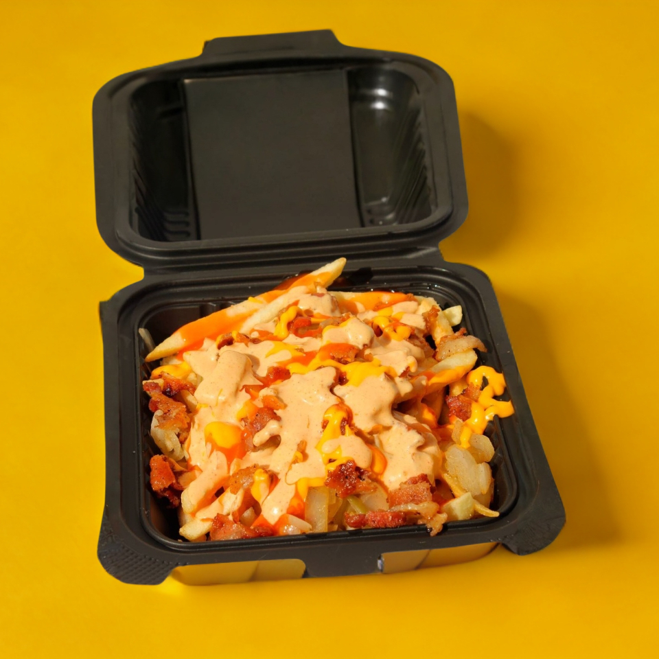 Nuestras papas a la francesa vienen doradas y crujientes, cubiertas con queso líquido cremoso, un toque de salsa búfalo para los que buscan ese sabor perfecto y nuestro aderezo secreto que lleva el sabor a otro nivel. Todo esto coronado con cebolla caramelizada y tocino crujiente. ¡Cada bocado es una explosión de sabor que no podrás dejar pasar!