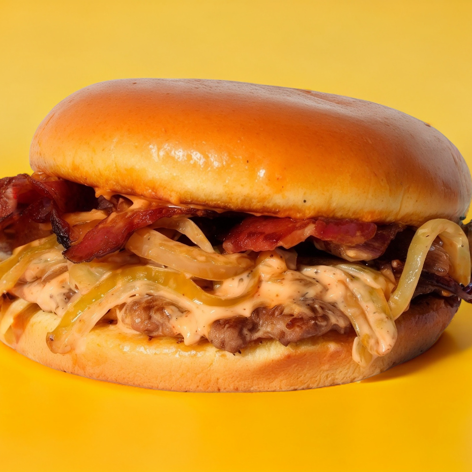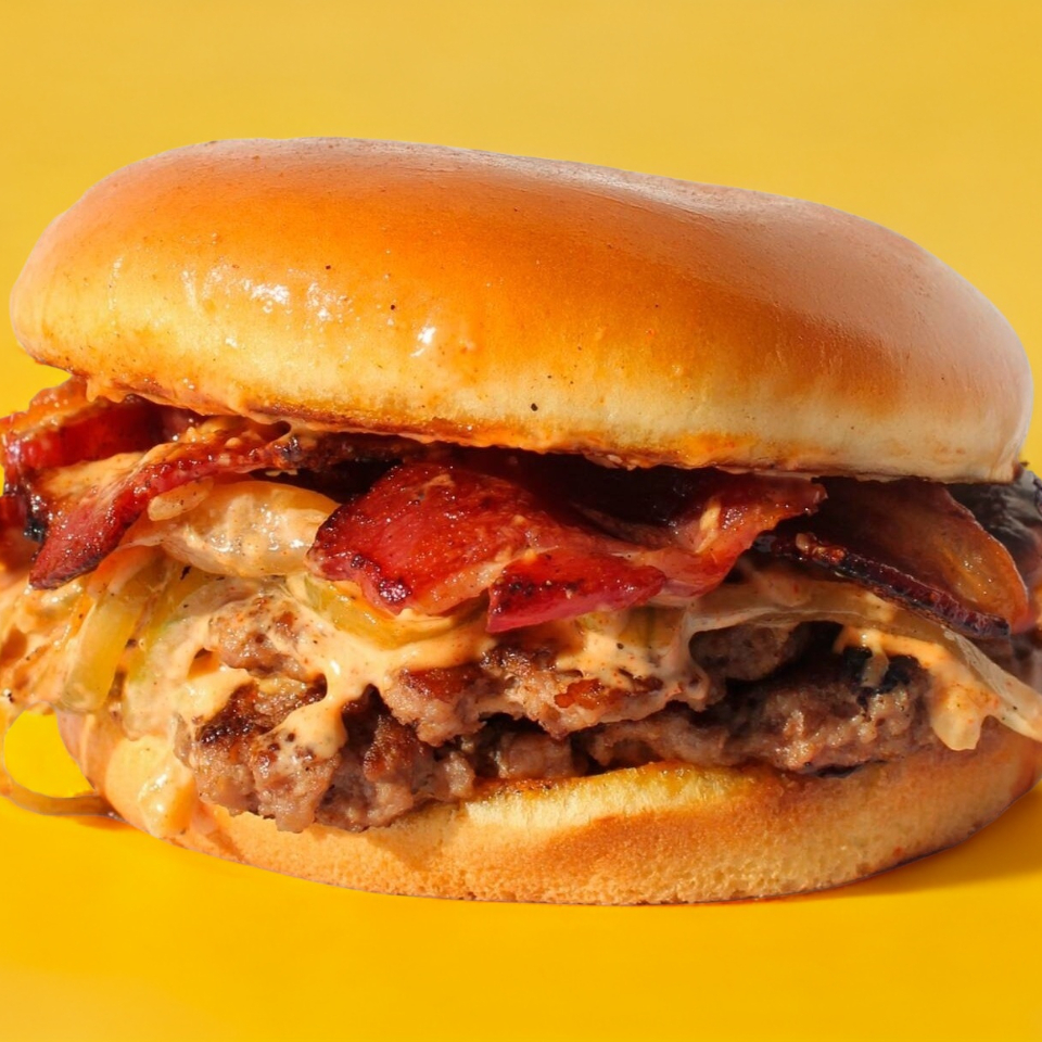 King's Bacon, preparada con 2 carnes al estilo smash, dorada y crujiente por fuera, pero jugosa y llena de sabor por dentro. Acompañada de tocino crujiente y ahumado, cebolla caramelizada que se deshace en cada bocado. Además, puedes elegir entre nuestro aderezo secreto Original o Sweet, ambos diseñados para elevar cada mordida.