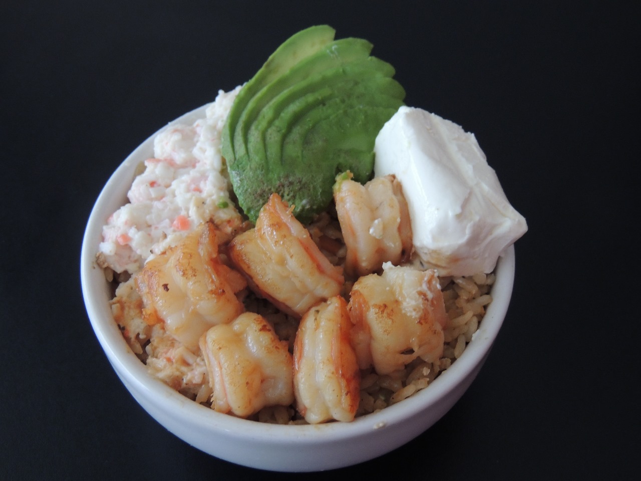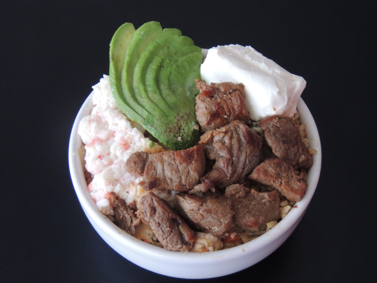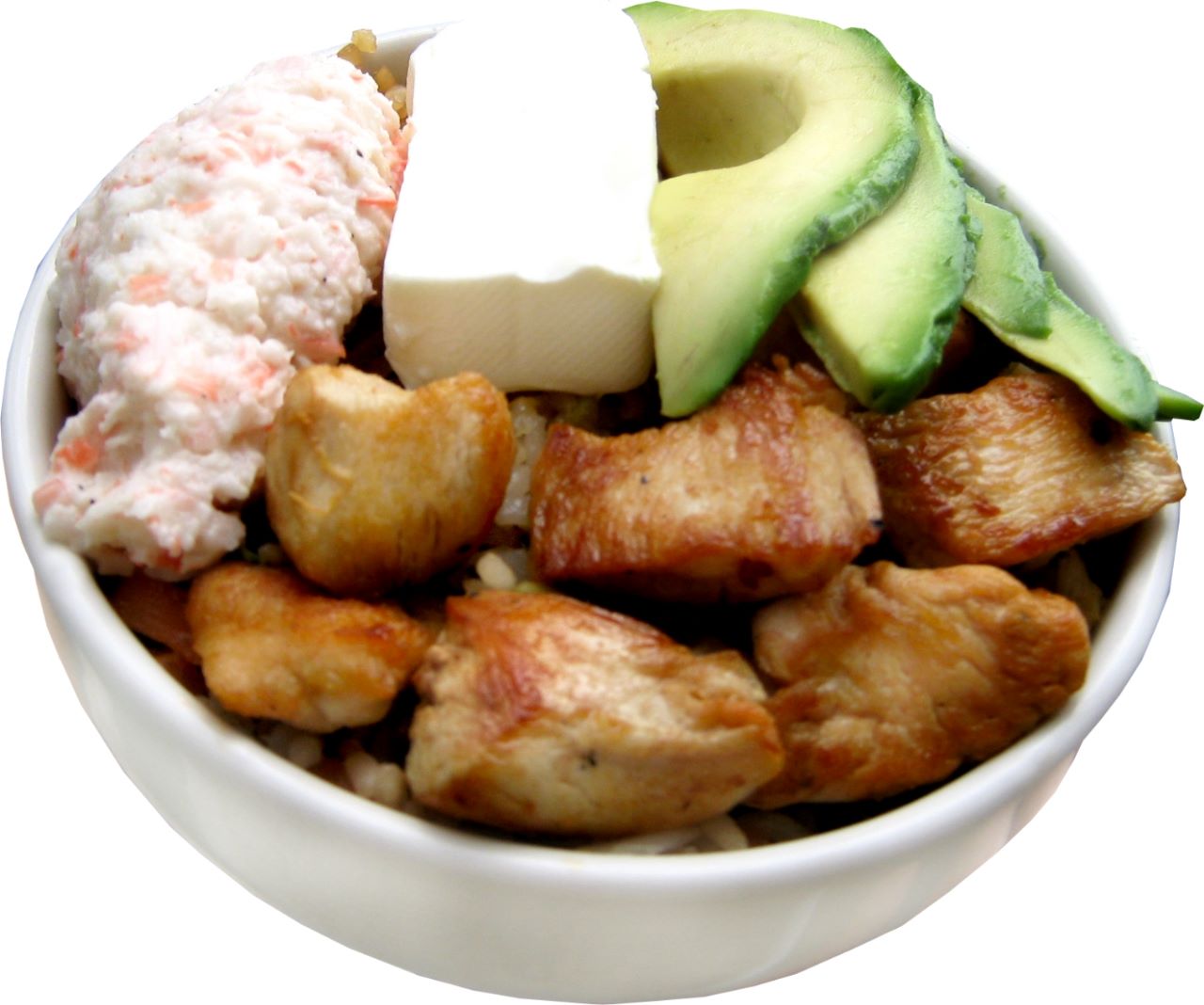 Yakimeshi Mixto Pollo/Res y Camarón, con aguacate, queso crema y tampico