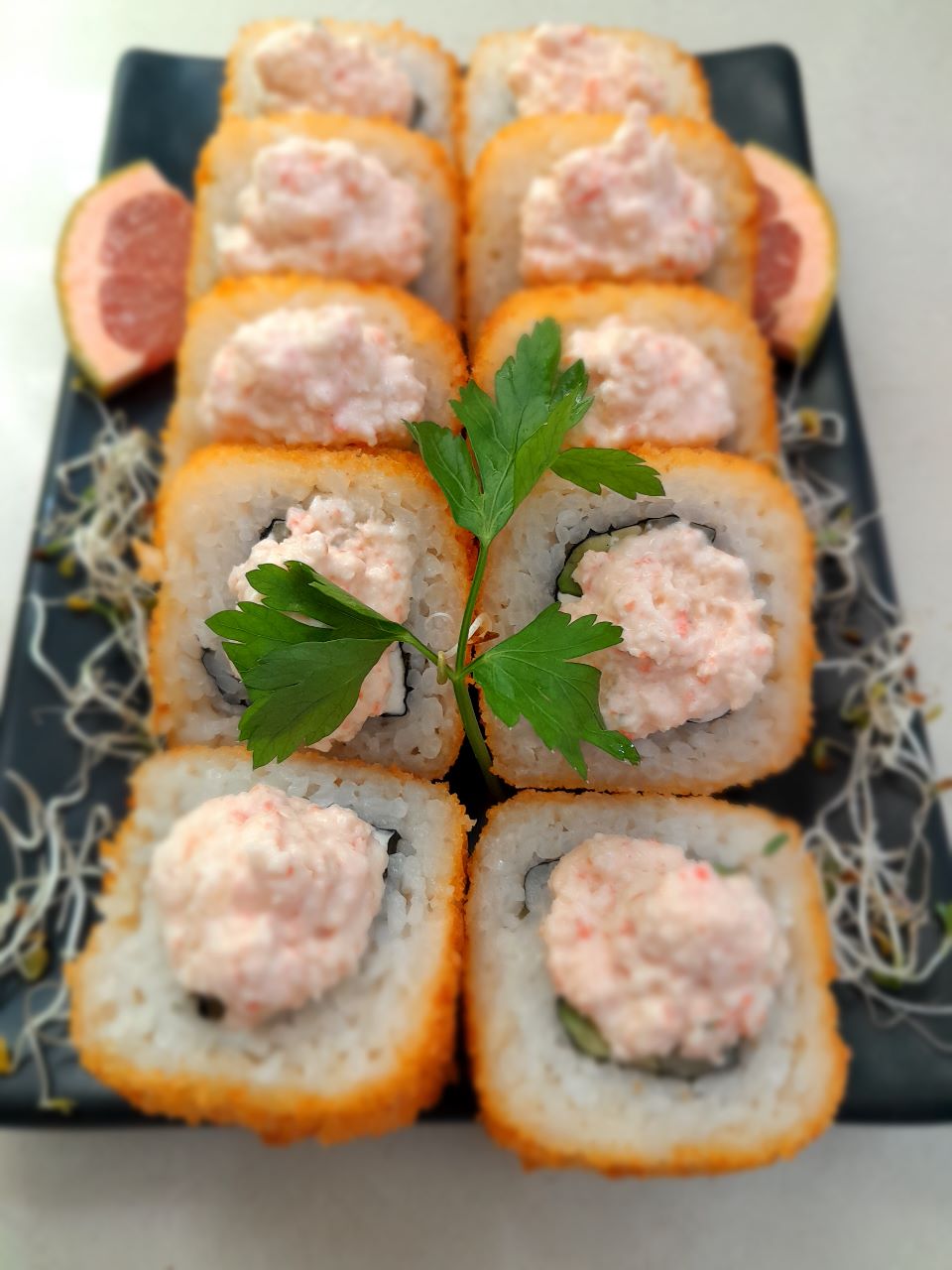 1/2 sushi surimi empanizado o filadelfia, 1 arroz de pollo especial y 1/2 litro de te
