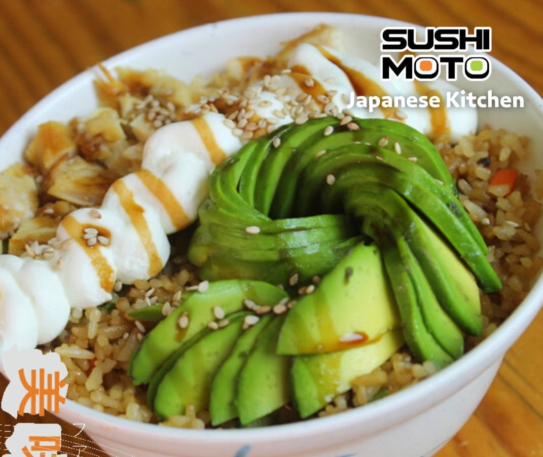 Arroz blanco acompañado de aguacate, Philadelphia, tampico y pollo frito.