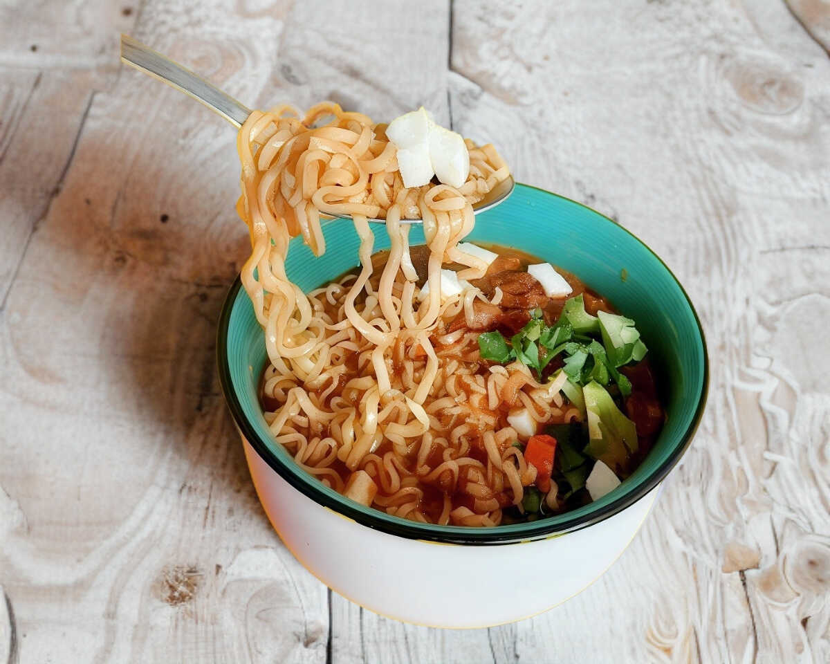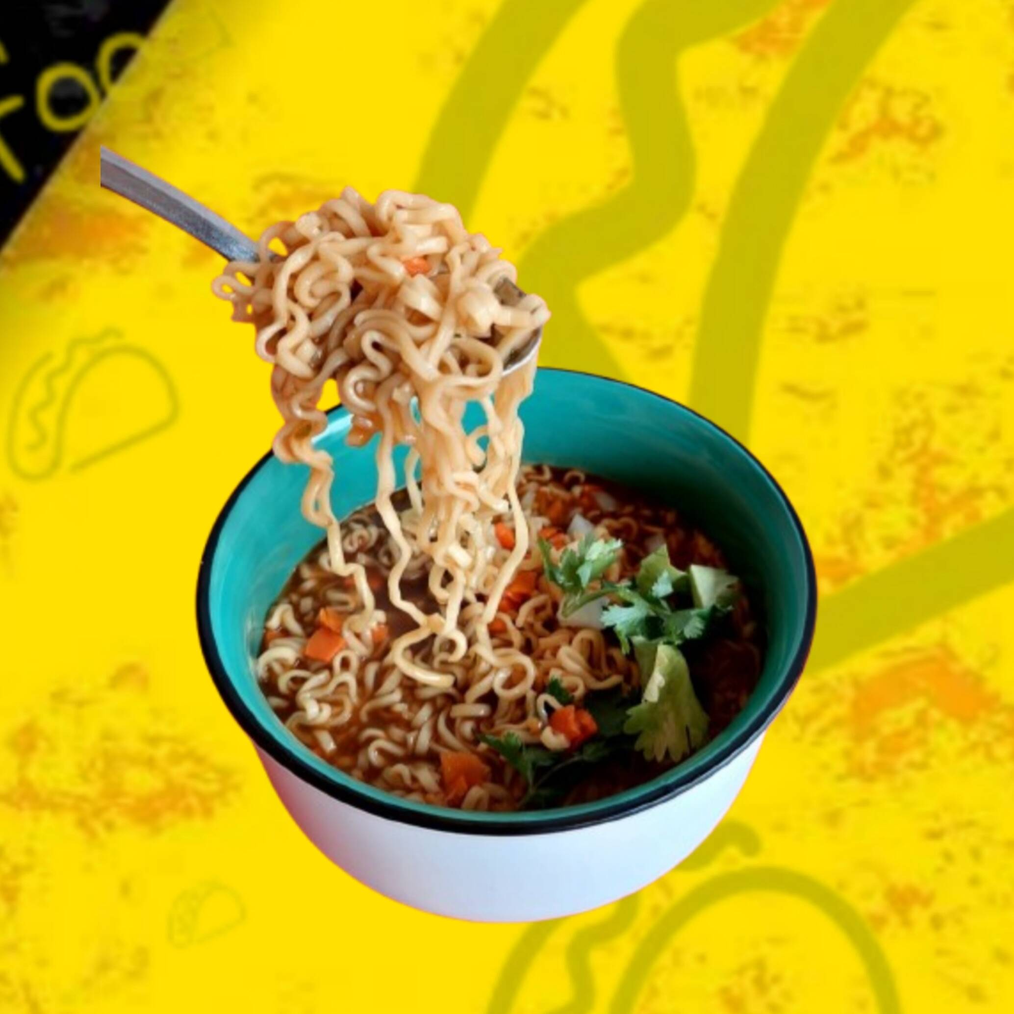 Pasta de ramen acompañada con carne, quesito, cebollita, cilantro y salsita al gusto