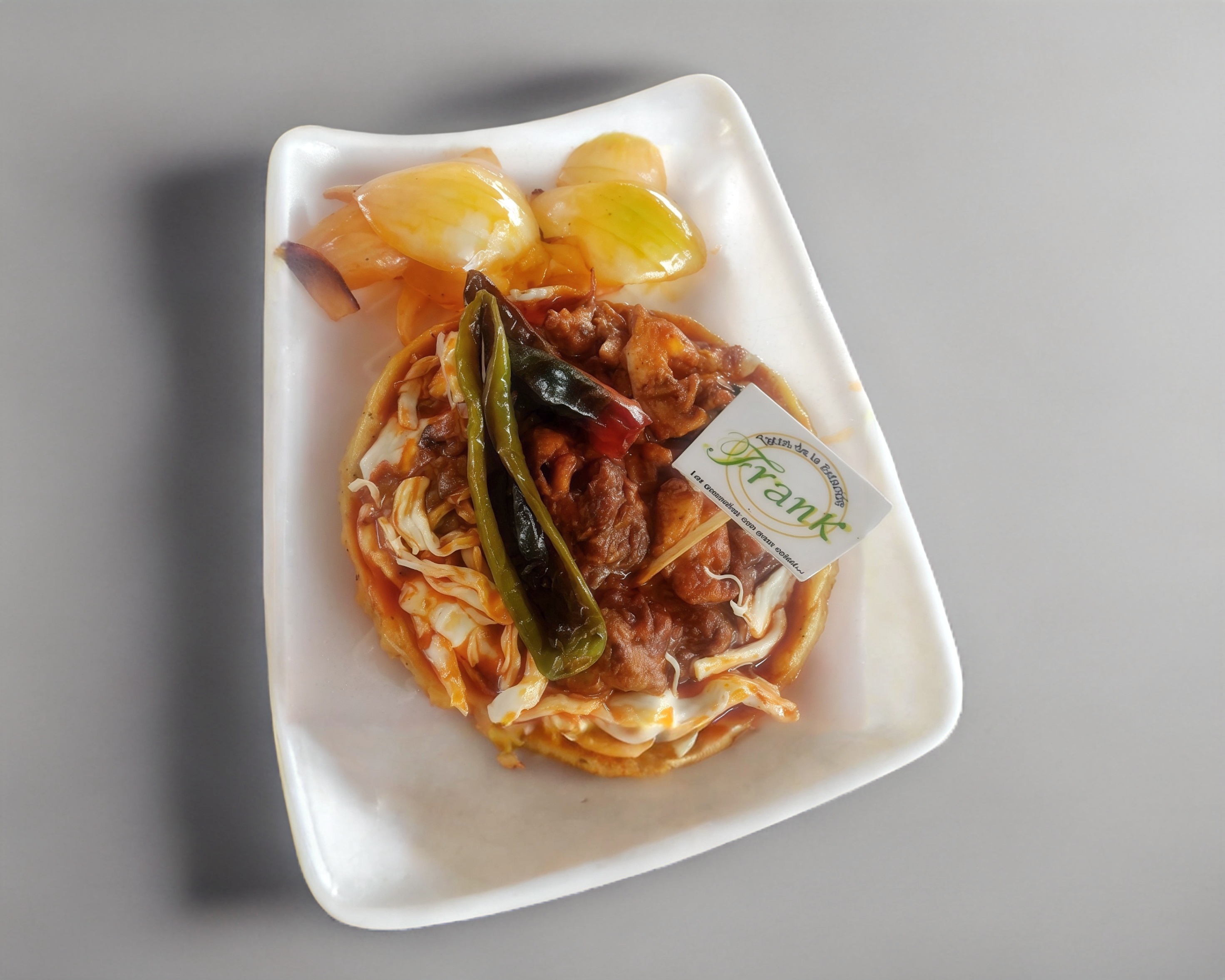 Tortilla de maíz + Queso Oaxaca + carne de los taquitos, acompañada de salsa, chiles toreados y cebollita