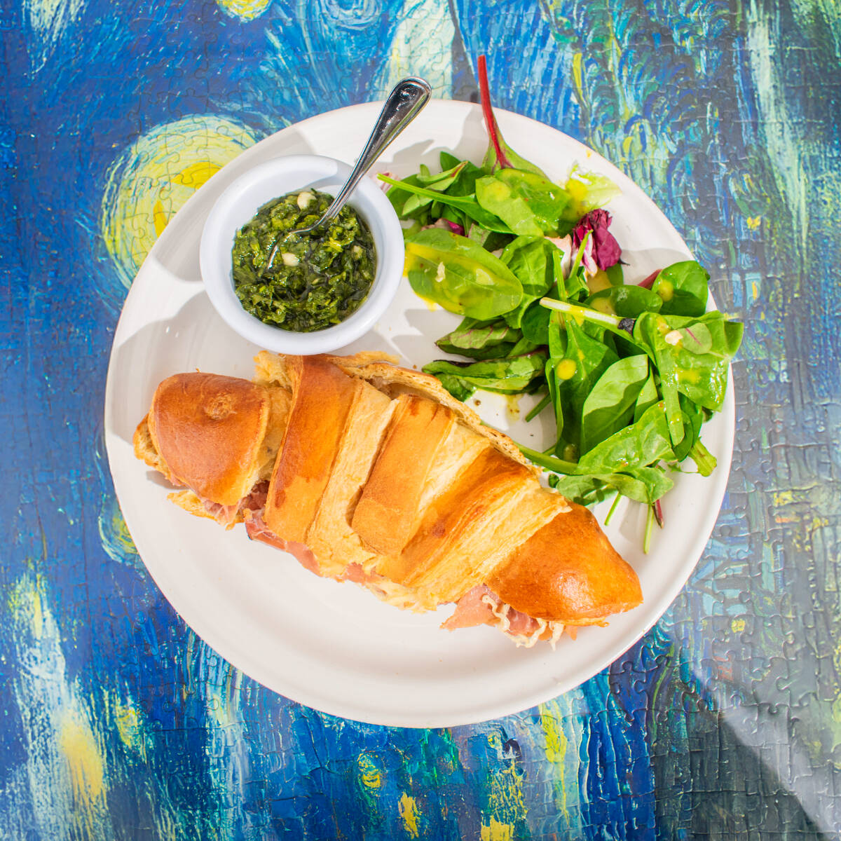 Croissant artesanal relleno, con mayonesa artesanal , acompañada de ensalada fresca con aderezo de la casa y chimichurri.