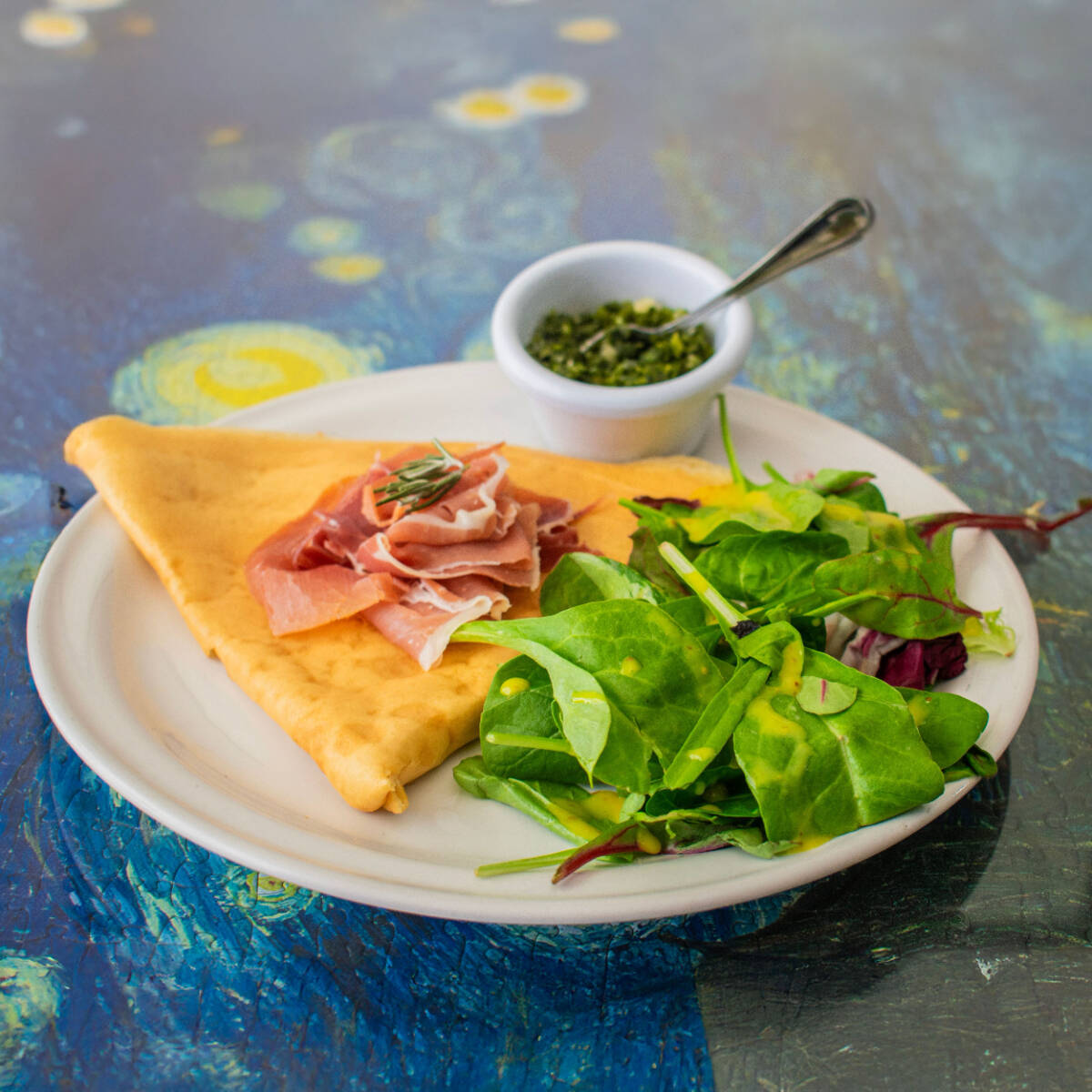 Crepa rellena de jamón serrano, acompañada de ensalada fresca con aderezo de la casa y chimichurri.