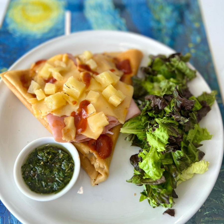 Crepa rellena de jamon piña, queso y salsa de tomate especial, acompañada de ensalada fresca con aderezo de la casa y chimichurri.