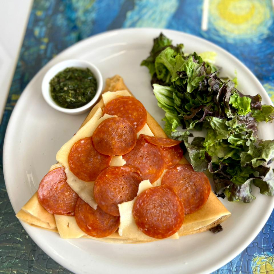 Crepa rellena de peperoni, queso y salsa de tomate especial, acompañada de ensalada fresca con aderezo de la casa y chimichurri.