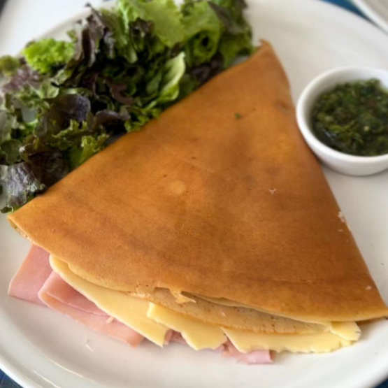 Crepa rellena de jamón y queso acompañada de ensalada fresca con aderezo de la casa y chimichurri.
