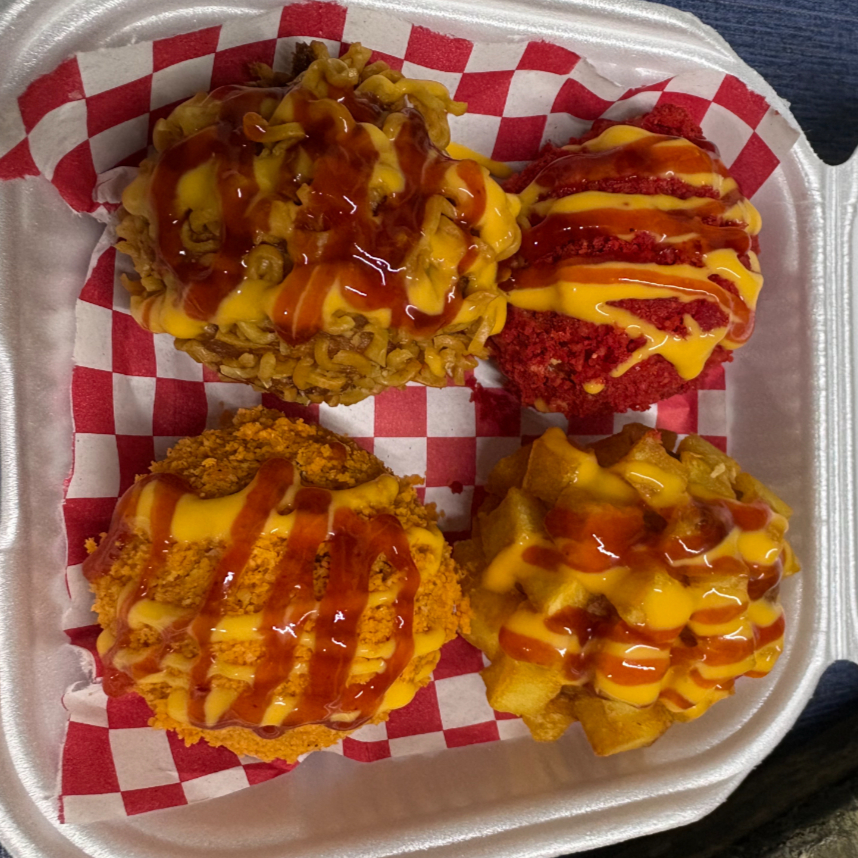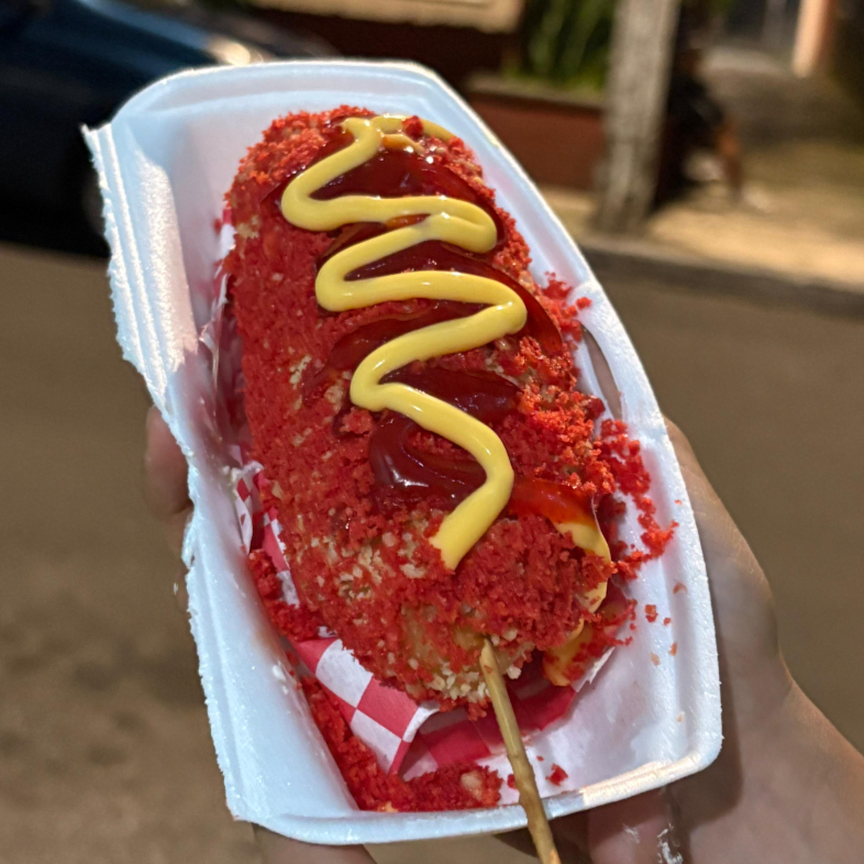Pequeña bola de Queso con Salchicha cubierta con polvo de Cheeto Flamin Hot