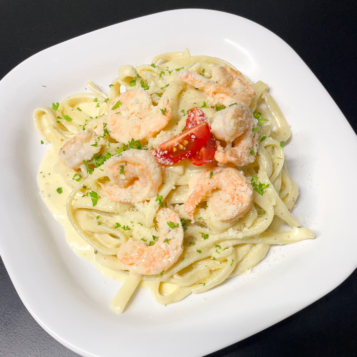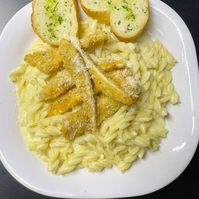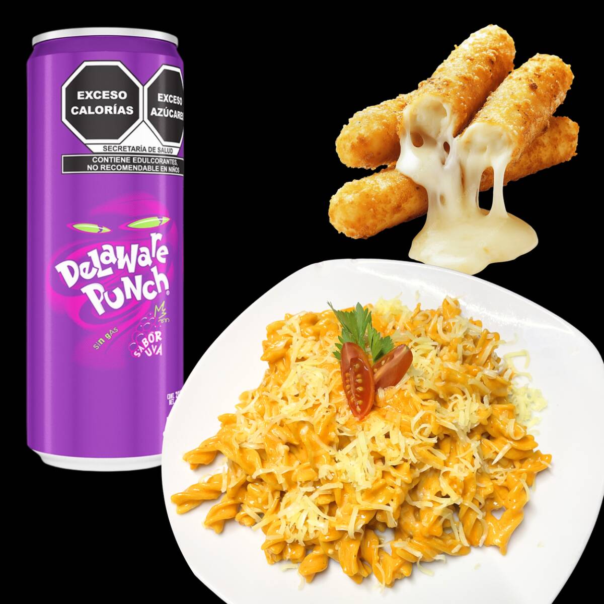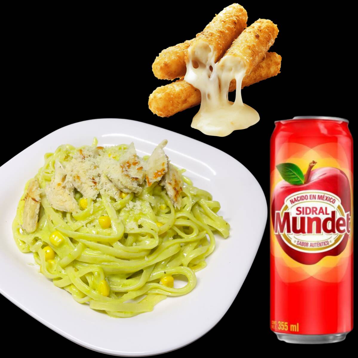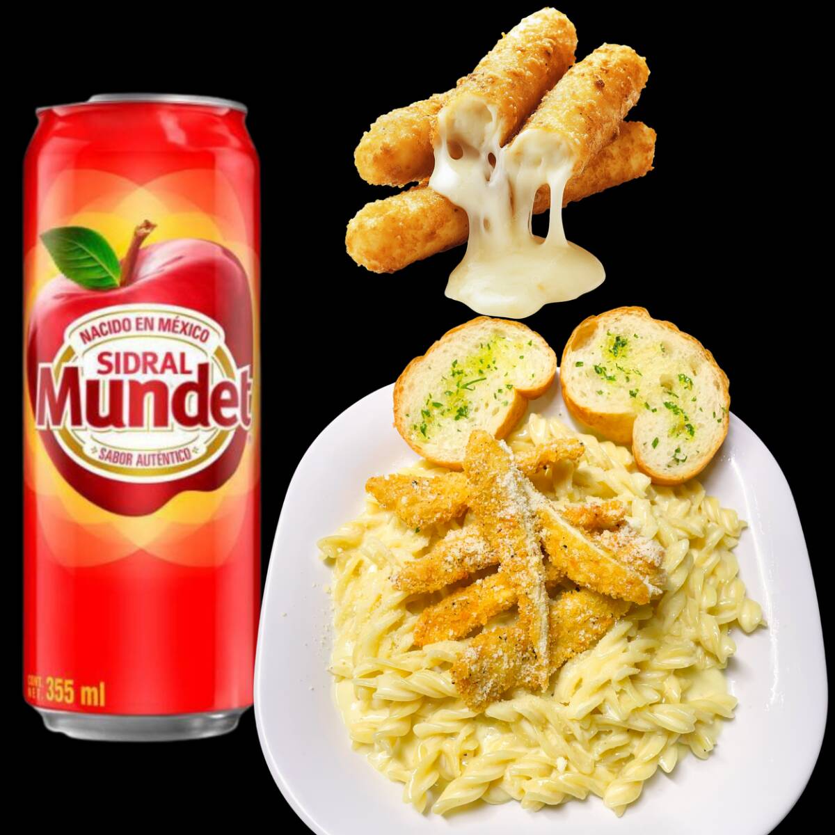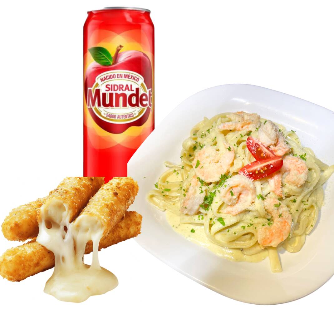 pasta alfredo con camarones o pollo, 3 pz de sticks de mozarrela y un refresco sidral mundet