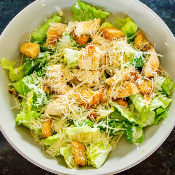 210gr lechugas orejona, crutones , pollo asado, parmesano y aderezo cesar artesanal