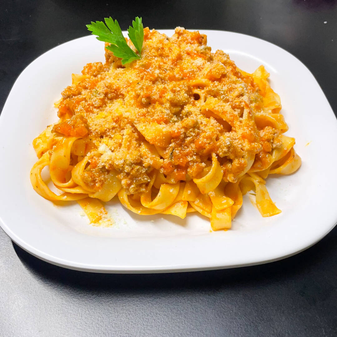 (380gr) Tradicional pomodoro con ragu de carne al estilo boloñesa terminada con parmesano. Se recomienda con tagliatelle, fettuccine o rigatoni