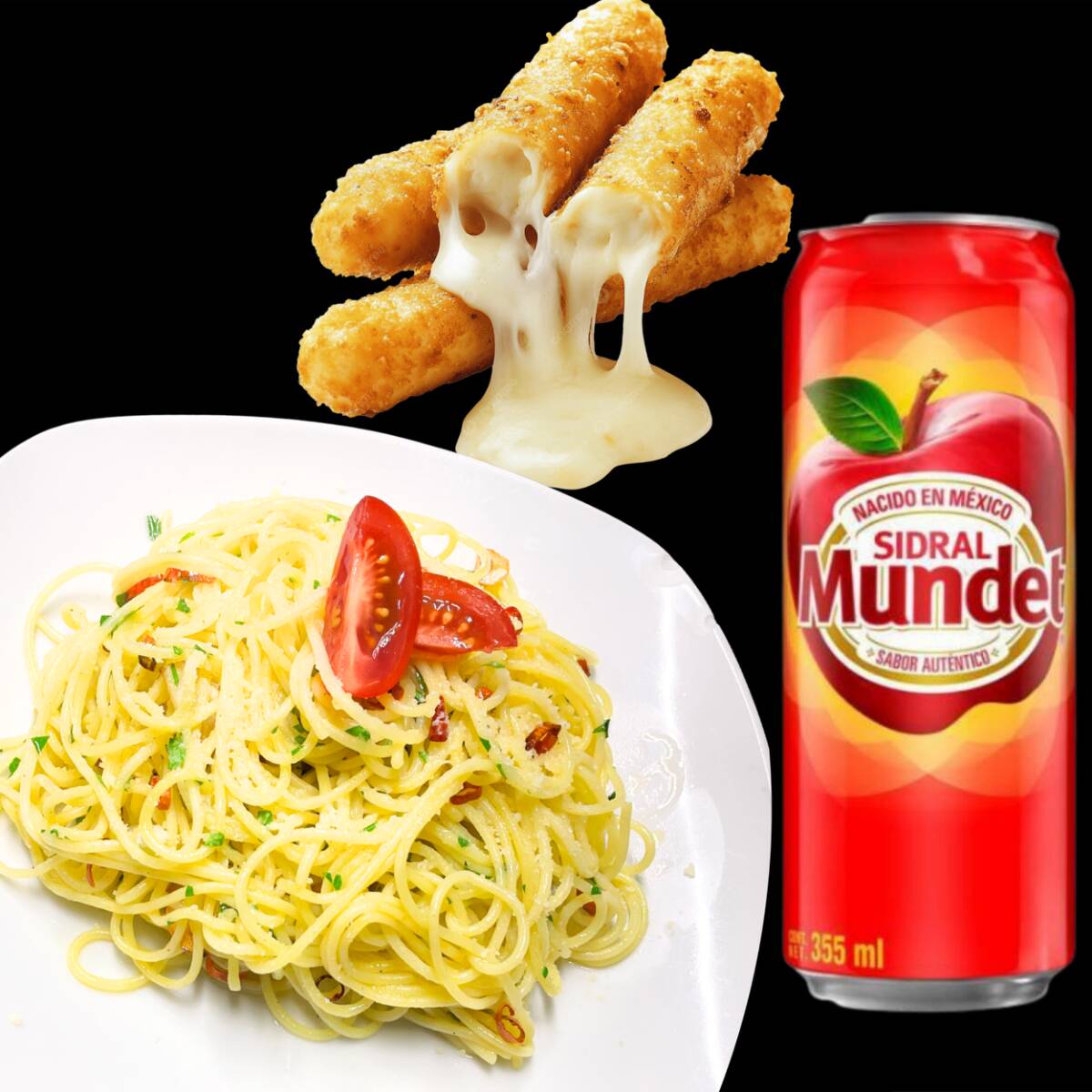 pasta agli e oleo + ord, stick de mozzarella y bebida