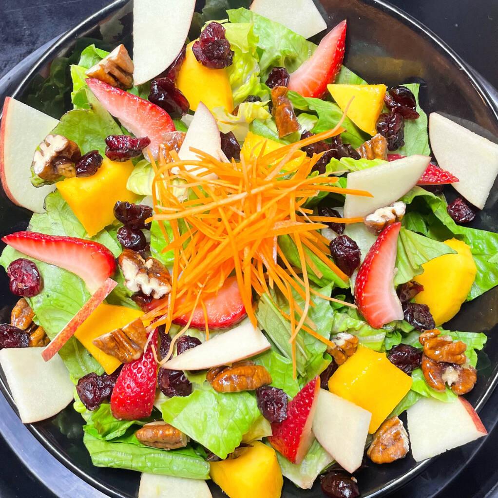lechuga fresca orejona, manzana roja, fresas, mango, arandanos, nuez caramelizada y suma de zanahoria acompañada de aderezo de frutos rojos