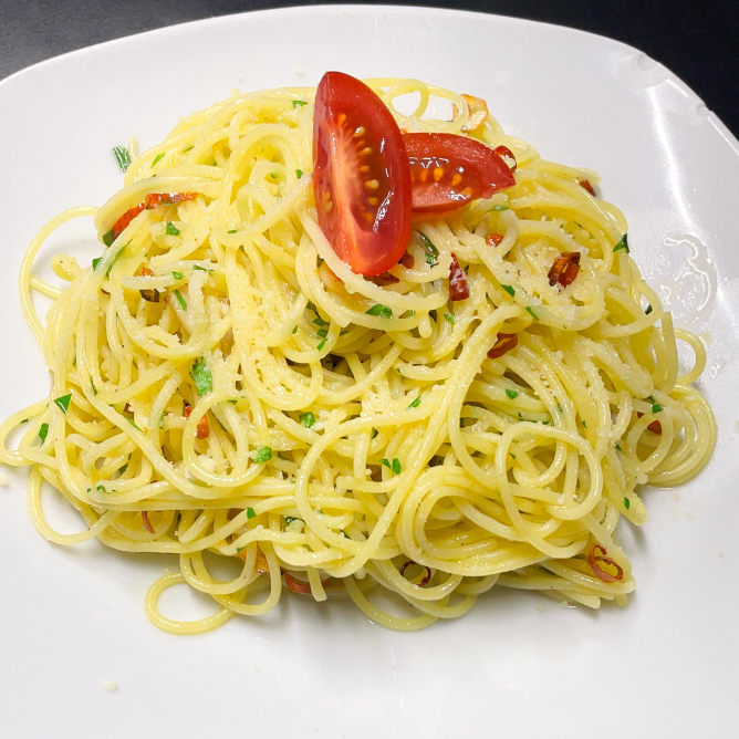 La clásica receta italiana, salteada en aceite de oliva con ajo, chile quebrado y perejil fresco, finalizada con queso parmesano. Se recomienda con spaghetti, fettuccine o linguine