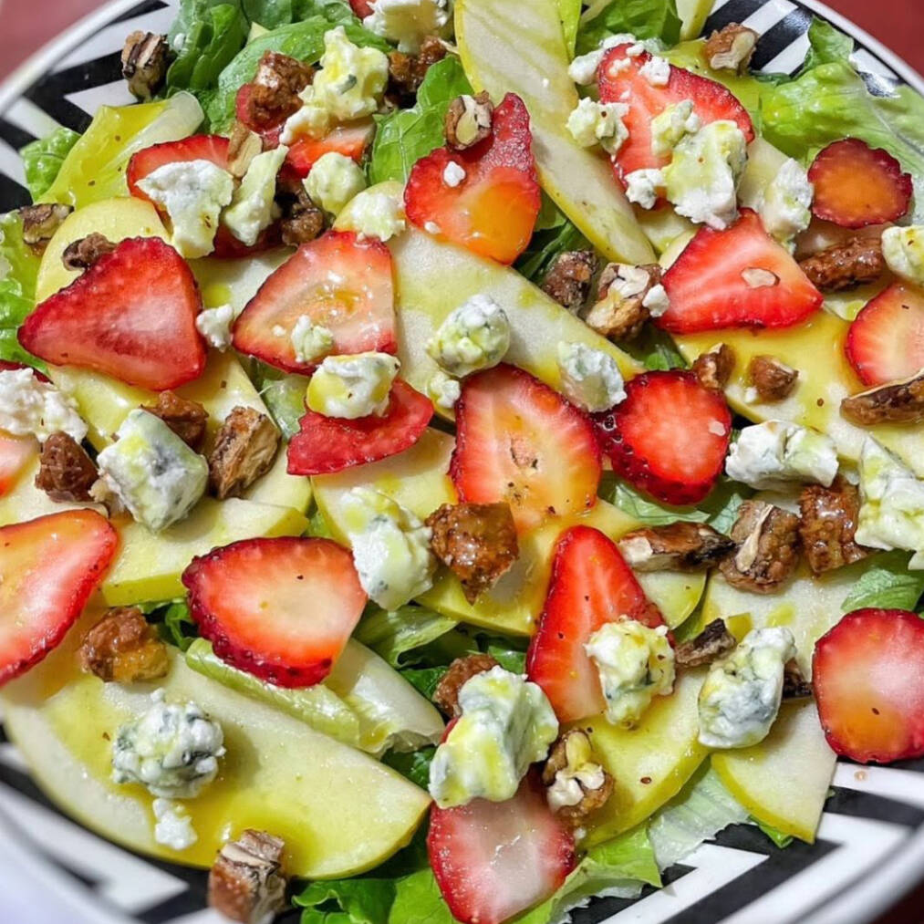 210gr lechuga orejona, fresas, manzana roja, nuez caramelizada y queso azul acompañada de aderezo de miel y mostada