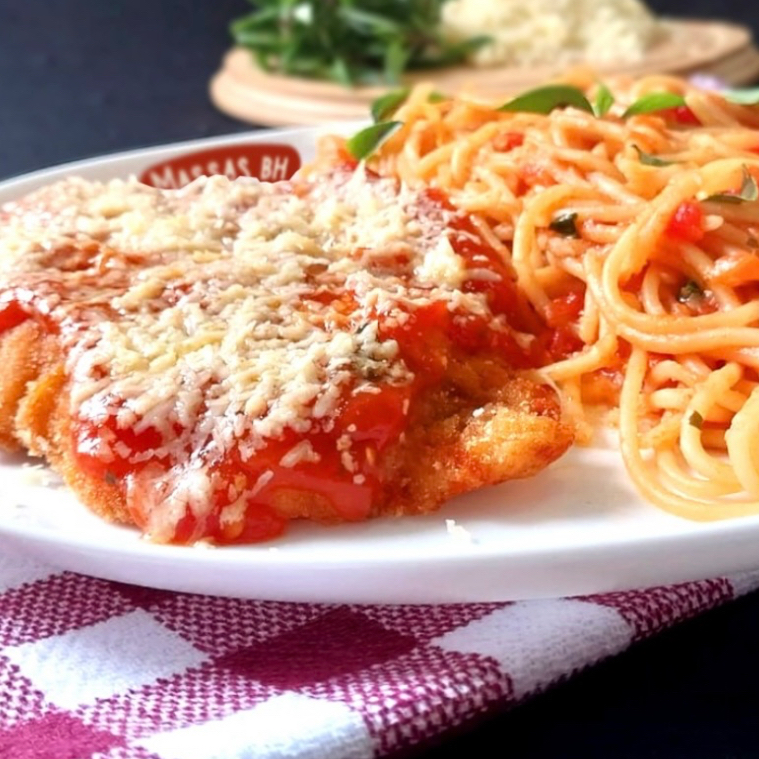 filete de pechuga de pollo empanizado con finas hierbas, bañado con salsa pomodoro y gratinado con quesos manchego y mozzarella terminado con parmesano. se acompaña con spaghetti pomodoro o al burro 320gr