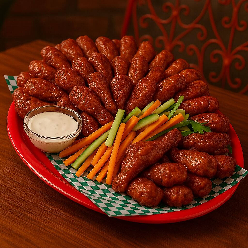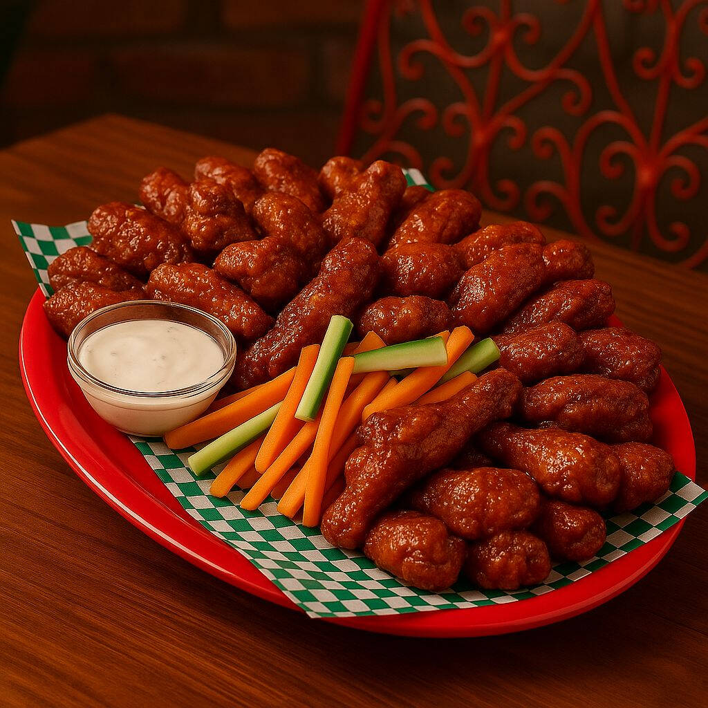 50 Alitas jumbo acompañadas de ensalada de la casa y puedes elegir hasta 10 sabores diferentes