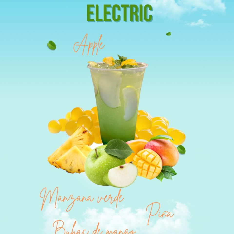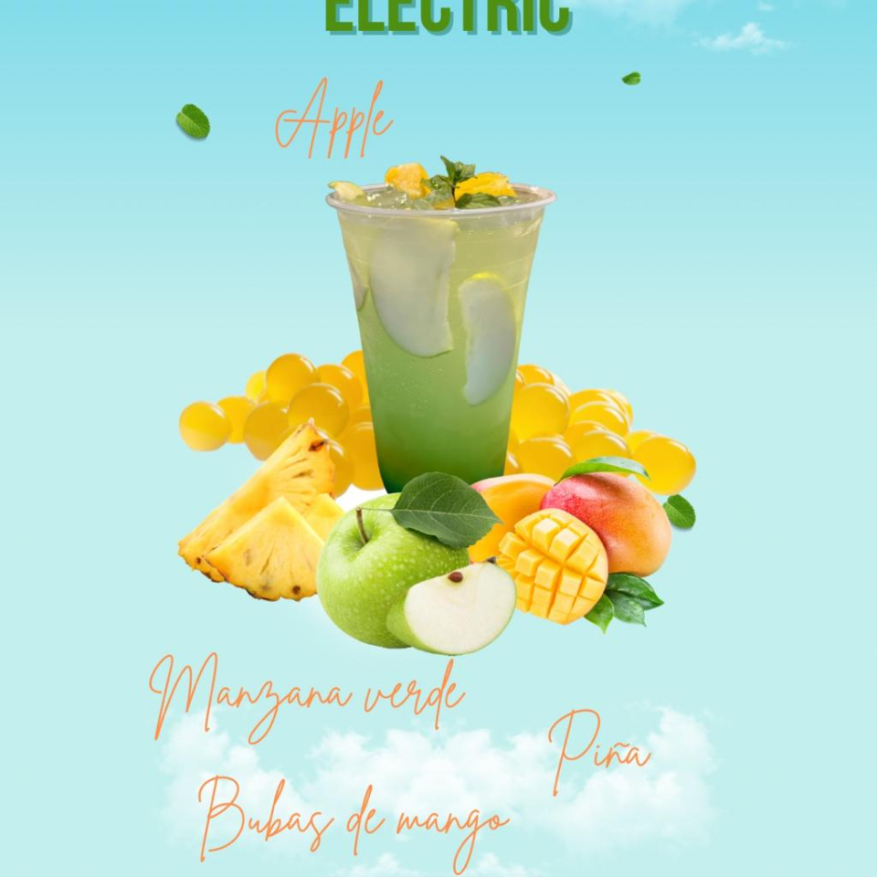 Una explosion de energia frutal!! Glitter de manzana verde y neon vibrante. Burbujas de mango y agua mineral con un toque de piña. Se corona con manzana fresca, piña jugosa y menta