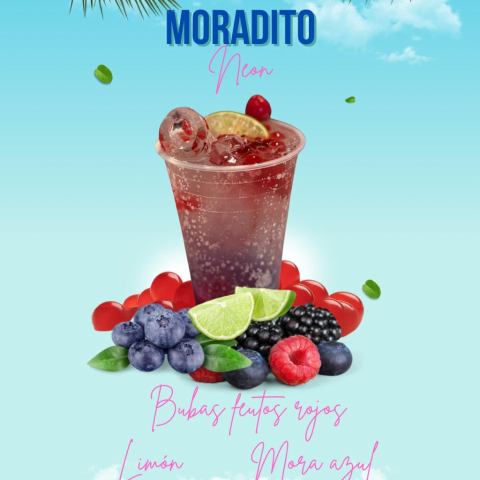 Explosión morada con un twist refrescante! limonada neón mora azul bubas frutos rojos agua mineral hielo Un sabor electrizante chispeante y lleno de color