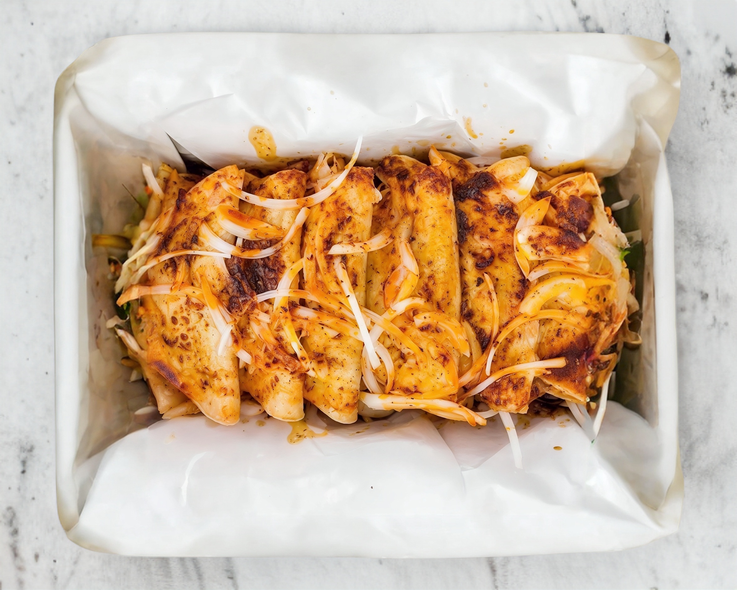 Orden de tres taquitos de pollo en barbacoa. Incluye complementos