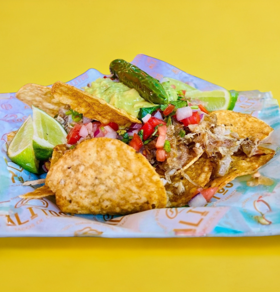 Tres taquitos de carnitas michoacanas al mero mero estilo aliToS. Incluye complementos.