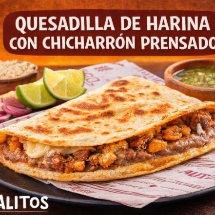 3 quesadillas de tortilla de harina con una mezcla de queso manchego y Oaxaca y el guisado de tu elección
