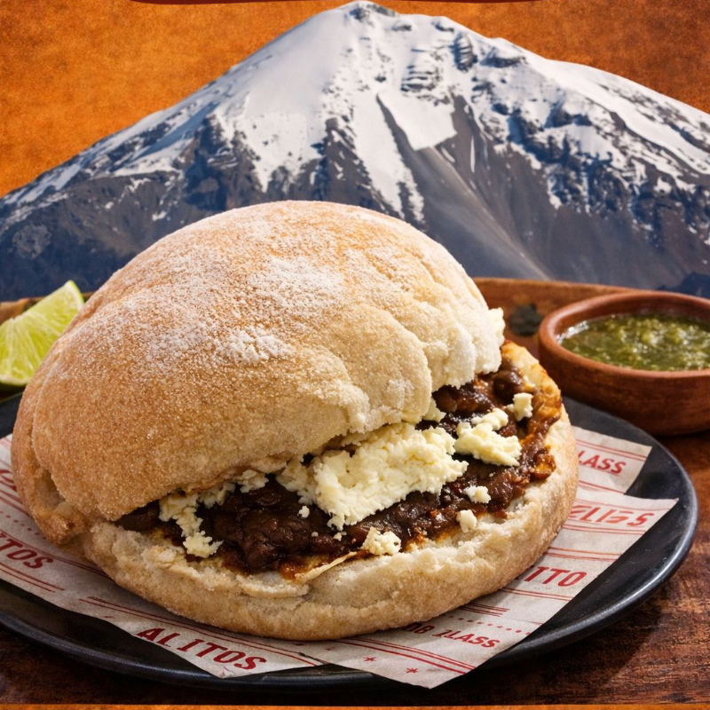 pambazo tradicional Orizabeño con frijolitos, mayonesa y el guisado de su elección