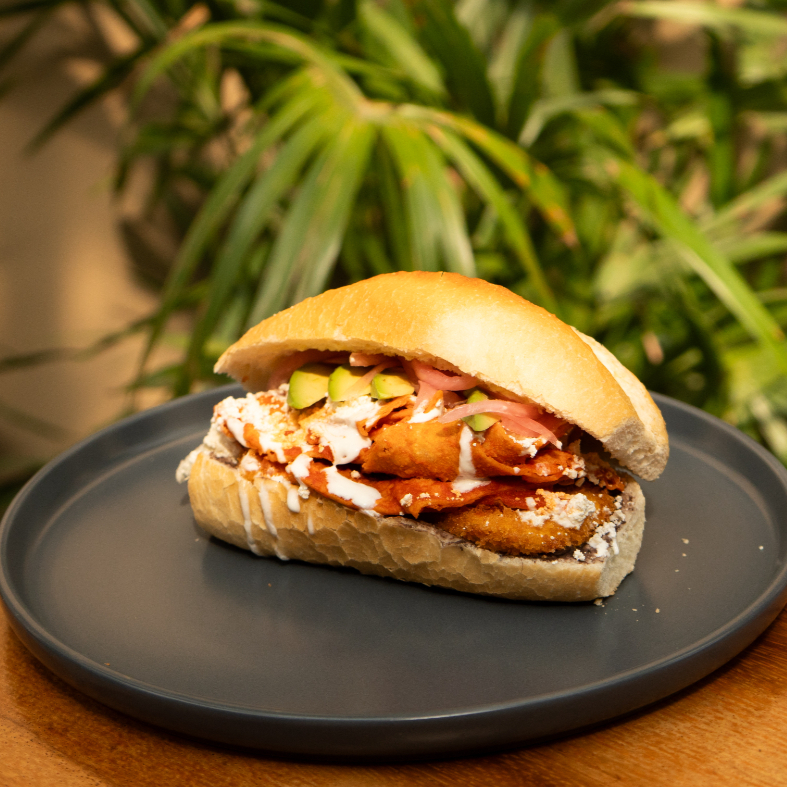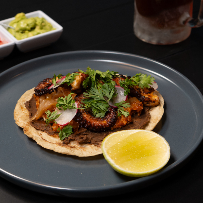 BAÑADOS EN SALSA DE CHILE MORITA, ACOMPAÑADOS CON CREMA, QUESO CHIAPAS, CEBOLLA CURTIDA Y CREMOSO DE AGUACATE, CORONADOS CON BABACOA DE LA CASA.
