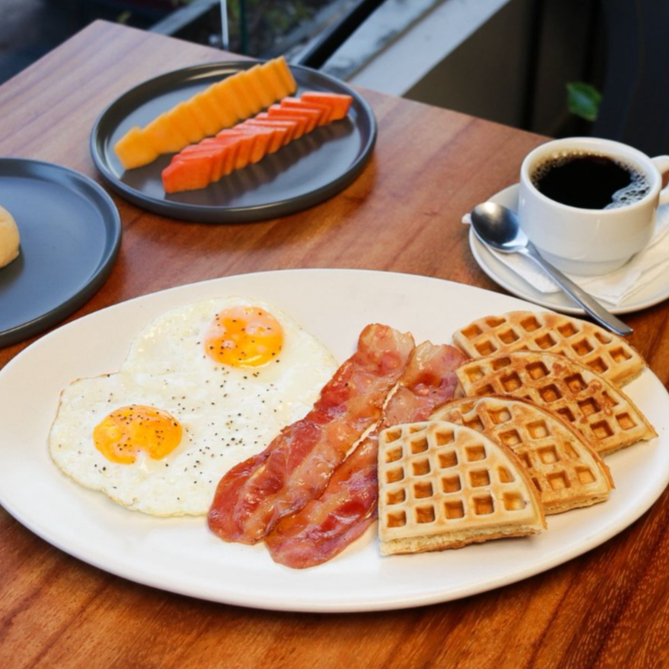 HUEVOS ESTRELLADOS, CON TOCINO GLASEADOS Y WAFLES.