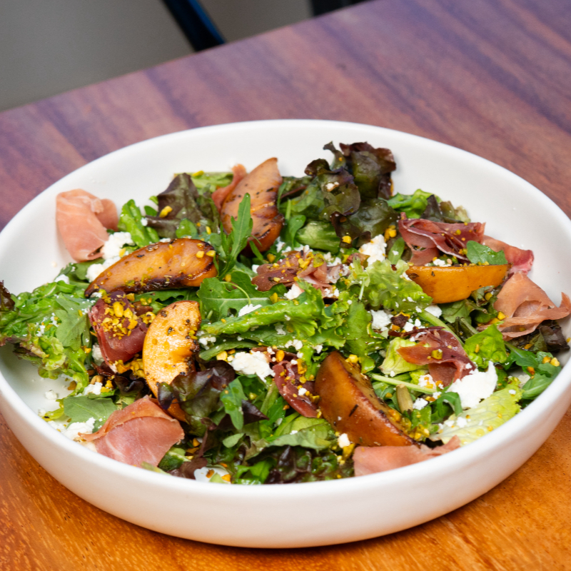 BASE DE LECHUGAS, ARUGULA, DURAZNO, PISTACHE TOSTADO, QUESO FETA Y JAMON SERRANO. ALIÑADO CON VINAGRETA DE ROMERO Y TOMILLO