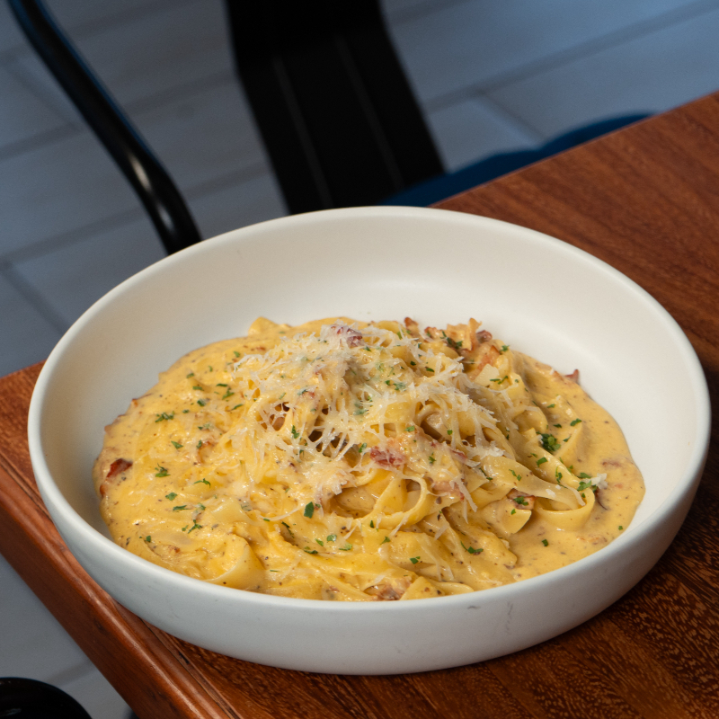 CREMOSA PASTA CON TOCINO CRUJIENTE, AROMATIZADA CON TRUFA.