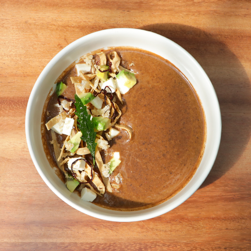 RELLENAS DE POLLO O HUEVO, BAÑADAS CON SALSA DE FRIJOL AROMATIZADA CON HOJA DE AGUACATE: COMPAÑADAS CON CREMA, QUESO CHIAPAS, CEBOLLA CRISPY, CHORIZO Y AGUACATE.