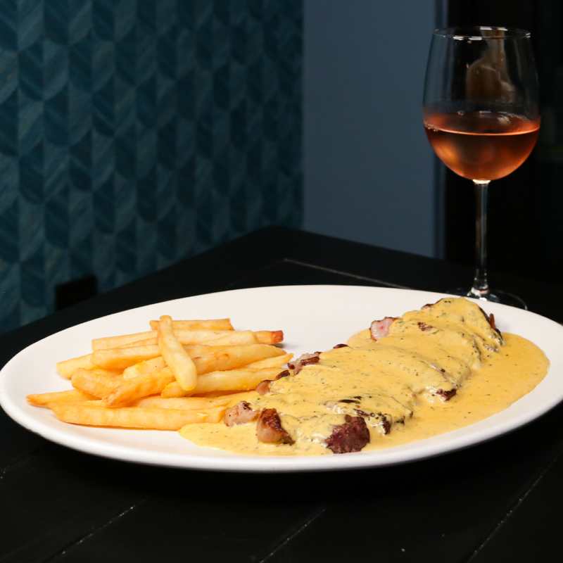 NEW YORK ANGUS BAÑADO CON UNA SALSA ESPECIAL DE LA CASA, ACOMPAÑDO DE PAPAS FRITAS.